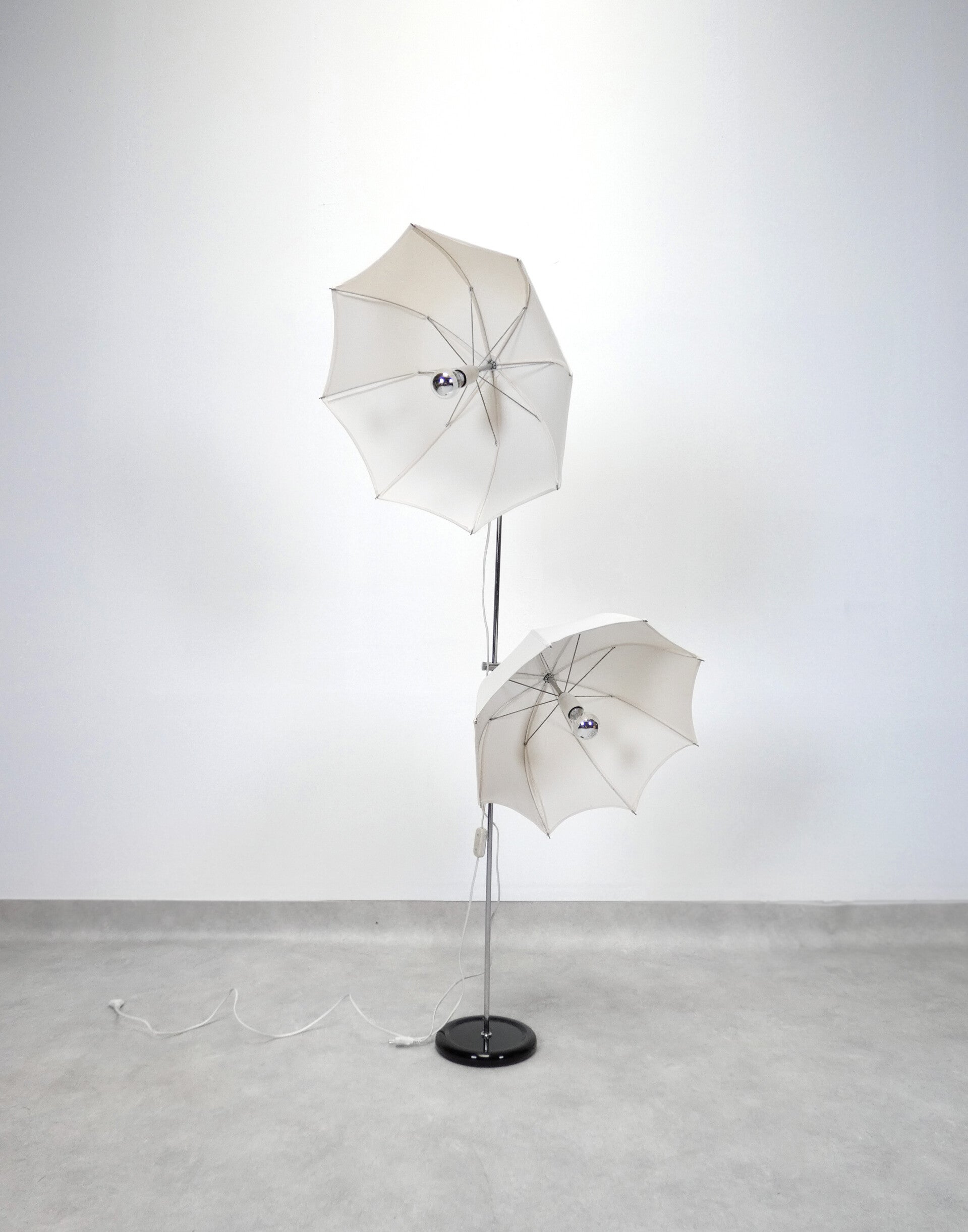 Vintage umbrella floor lamp made in 1970s with 2 umbrella lampshades that bring a lot of atmosphere in your home.