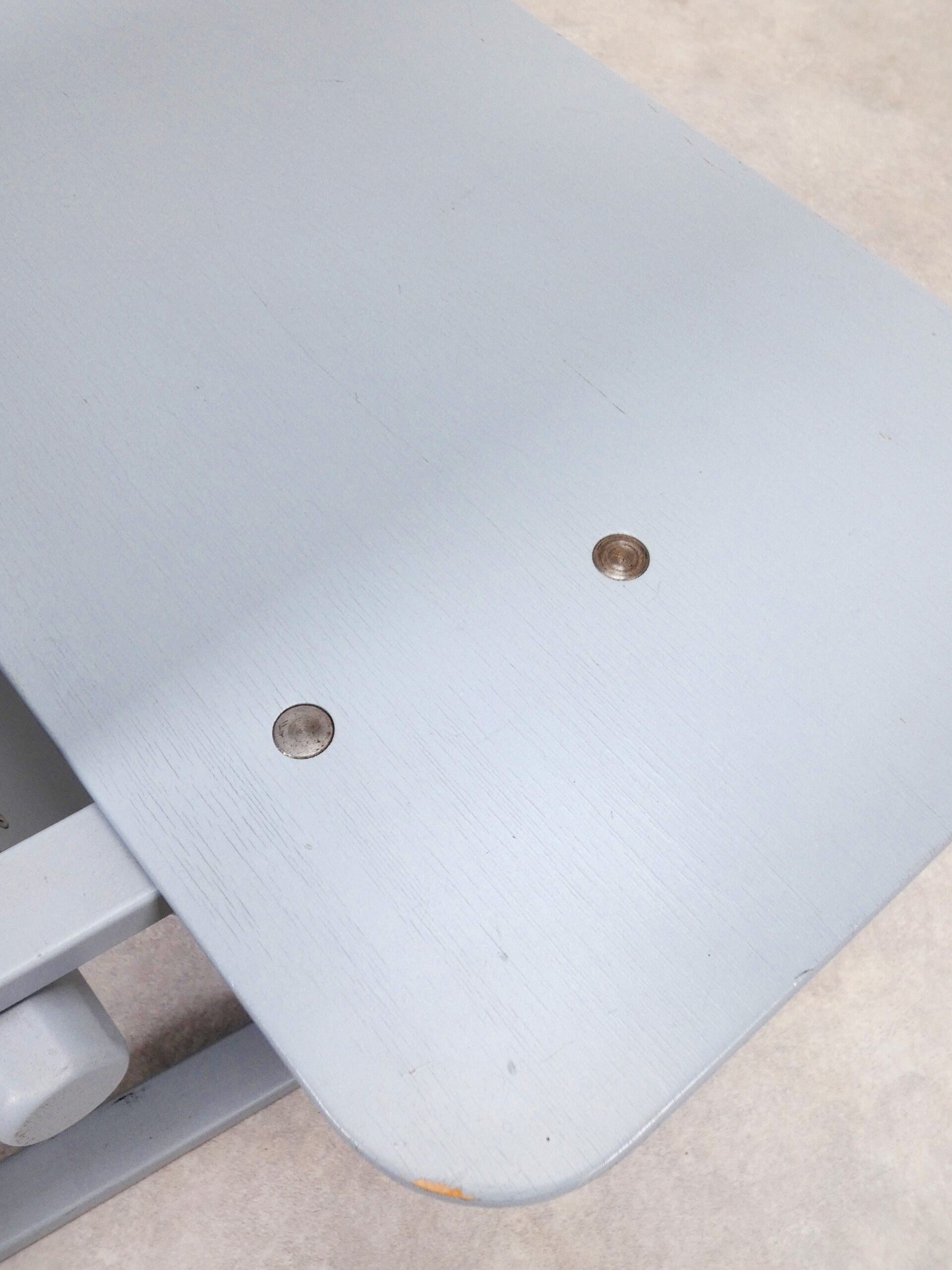 Lichtgrijs gelakt multiplex met origineel etiket van de fabrikant en vloerbeschermingsrubbers op de poten.