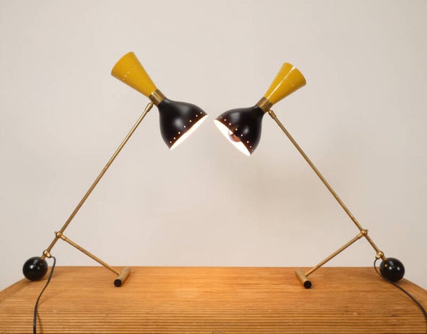 Mid-century tafellampen in Stilnovo stijl, gemaakt van 2 kegels gelakt in zwart/geel en een messing verstelbare voet.
