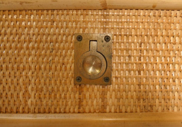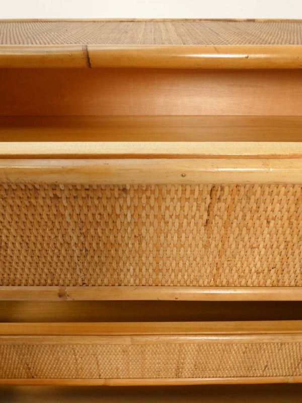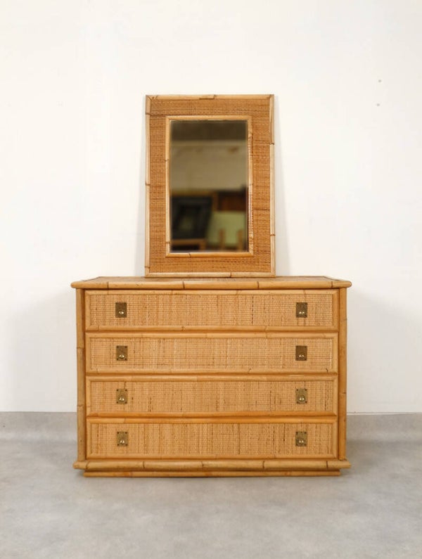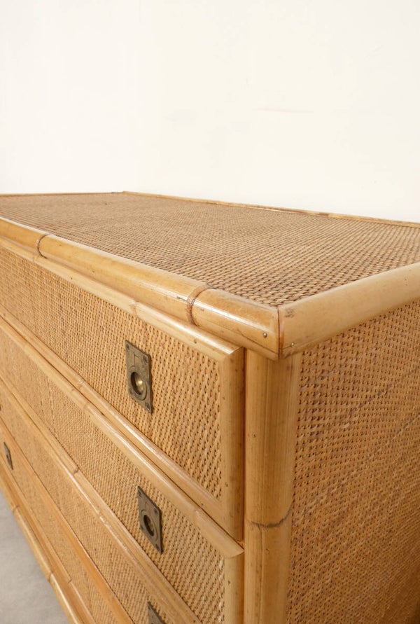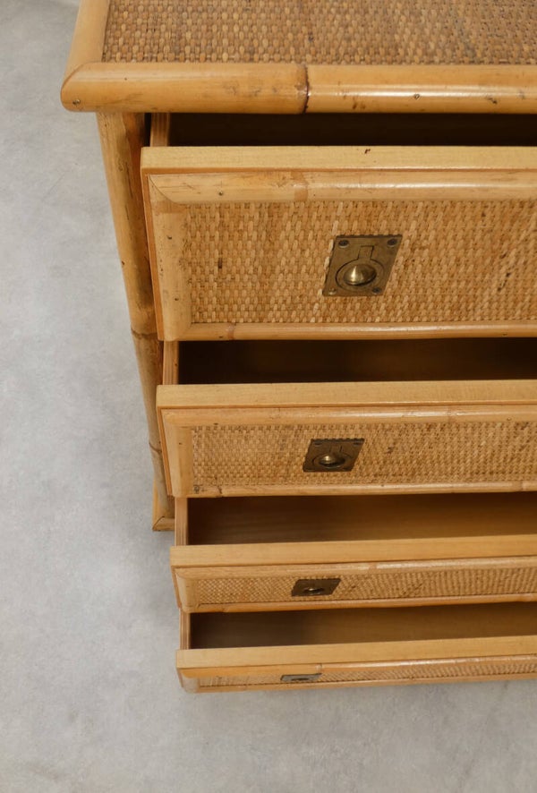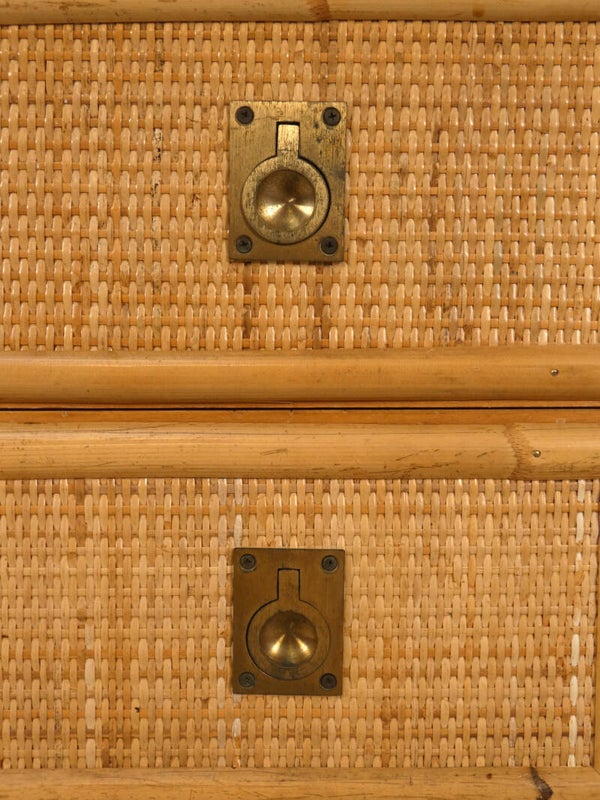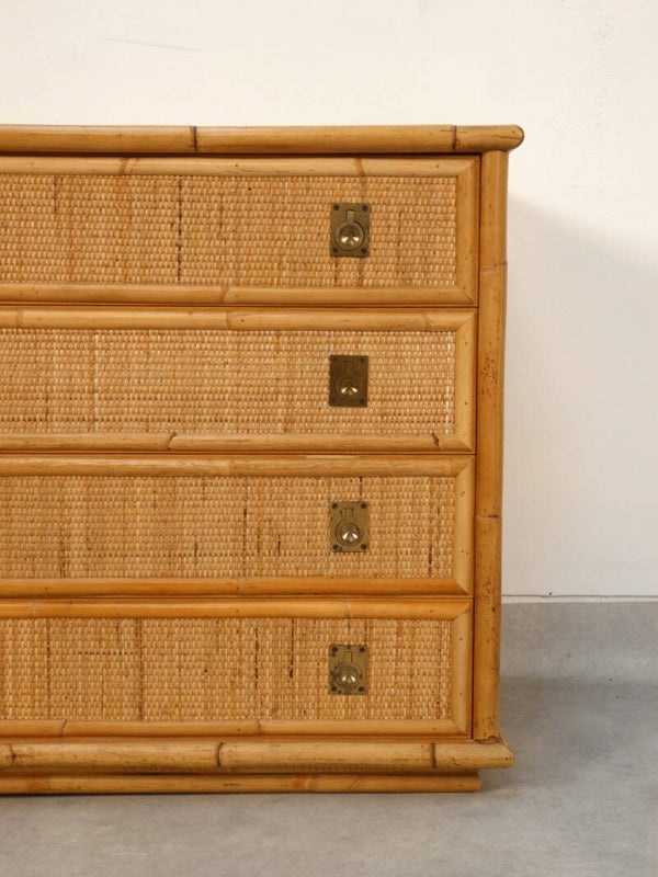 The dresser features four drawers with gilded brass handles. The wooden base structure is finished with bamboo, the top and sides are crafted from woven rattan, and the handles are made of brass.