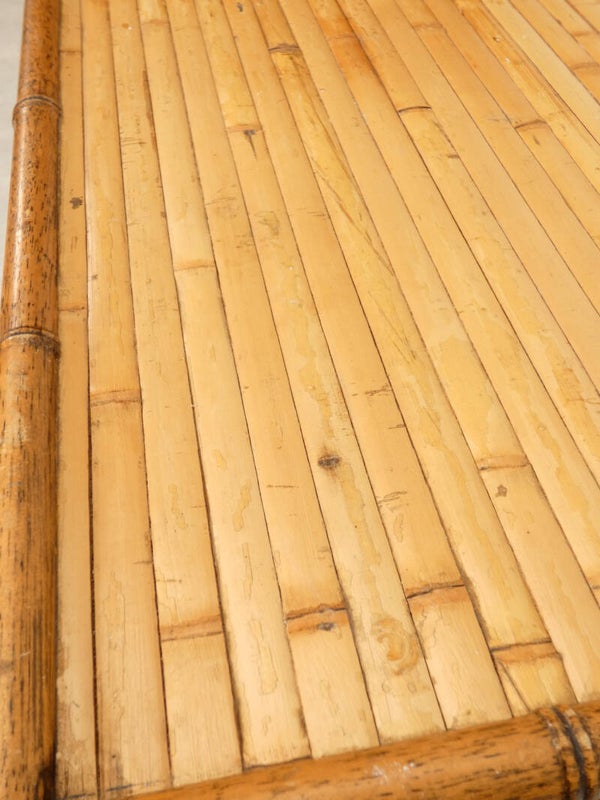 Good condition with minimal usermarks, the sidetable is missing one side piece of bamboo at one leg.