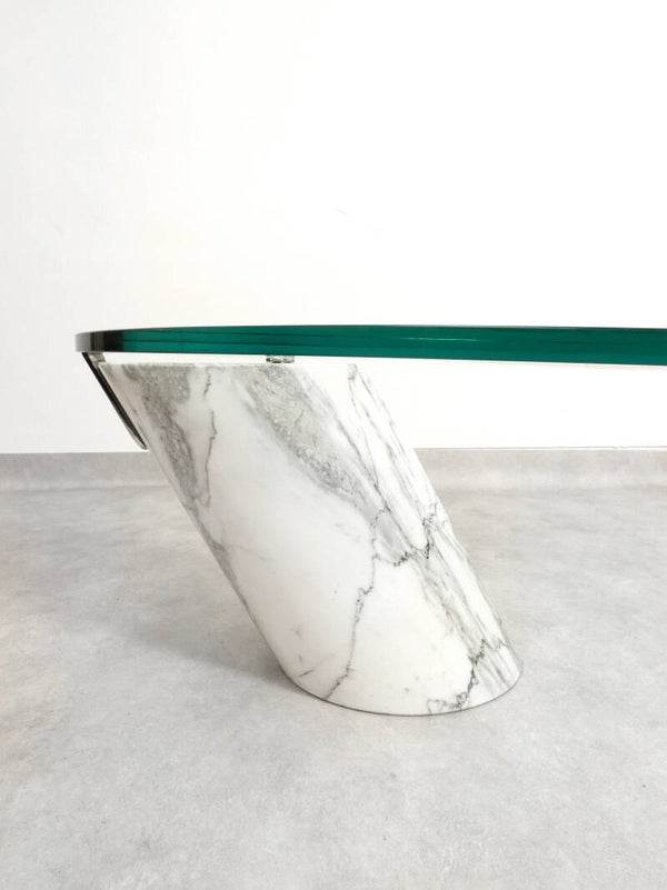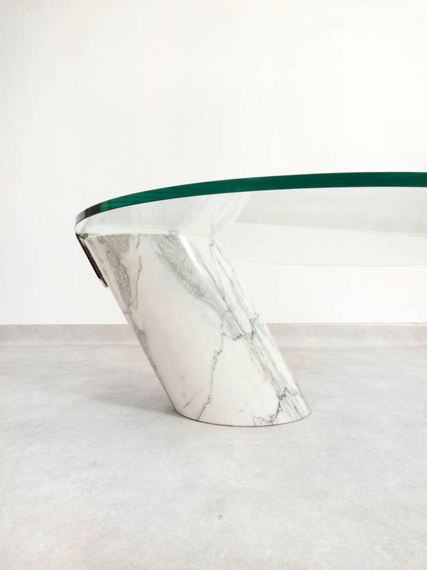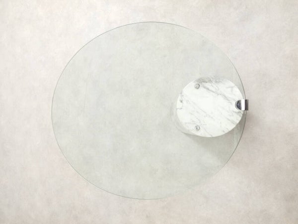 This table features a robust oval glass top balanced by a substantial marble base, creating an illusion of defying gravity while supporting a significant amount of weight. Items that are placed on top of the table seem to float.