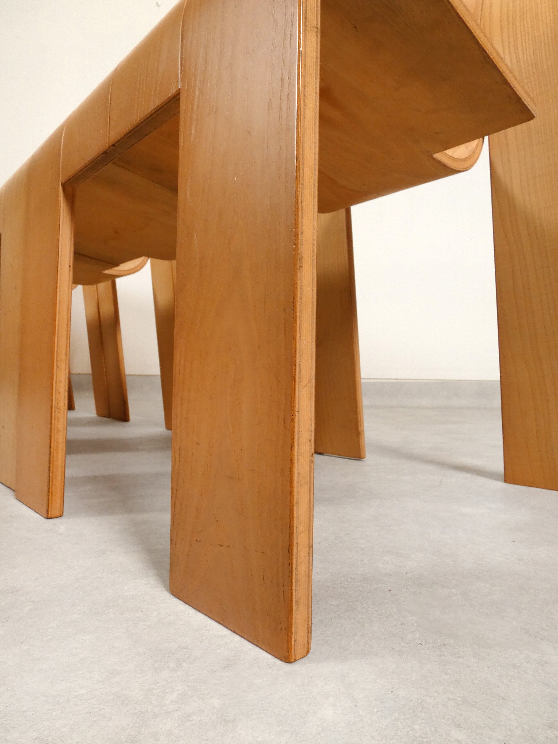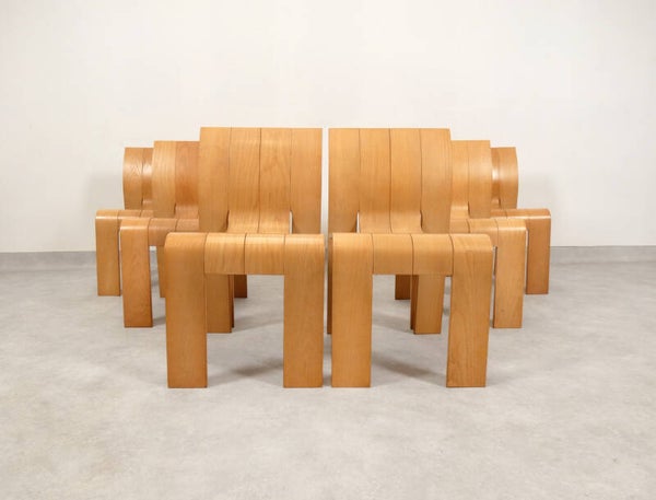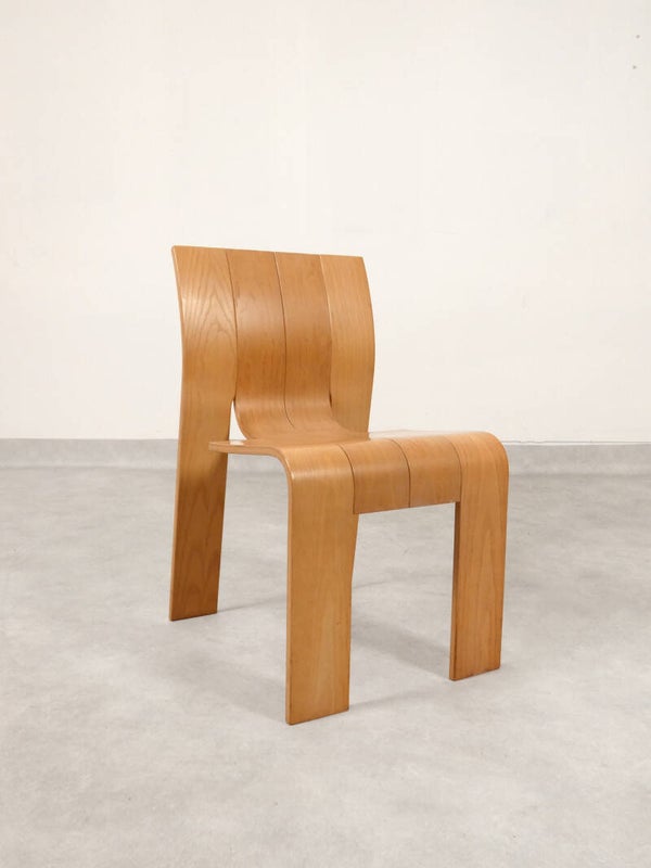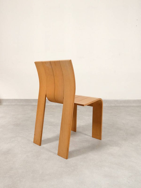 The chair is made from six 11 cm-wide strips of laminated beechwood, connected with dowels. The chairs are very sturdy and comfortable to sit on.