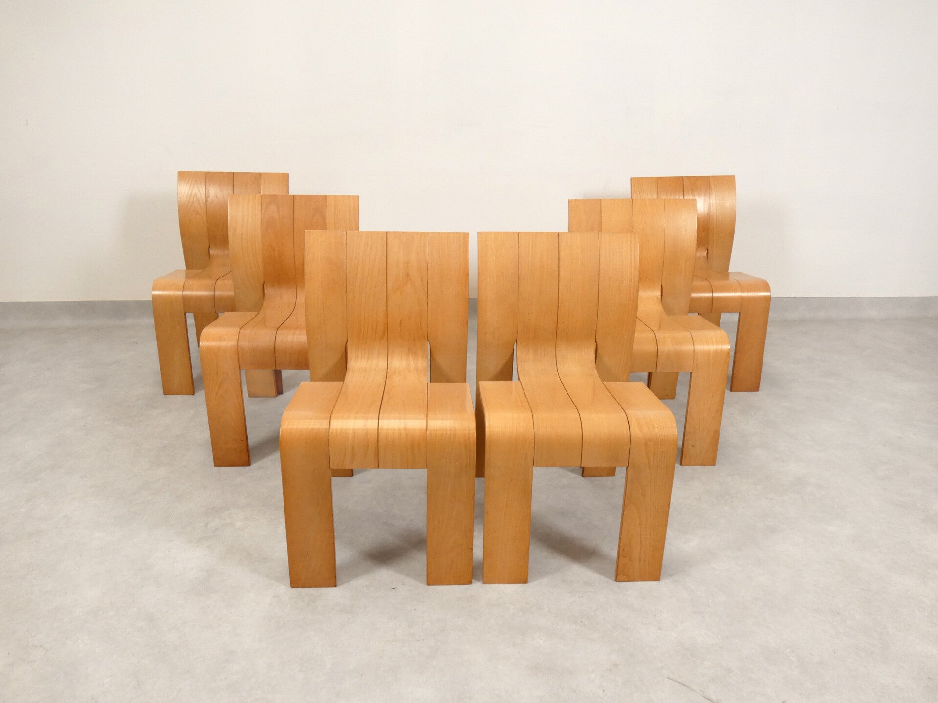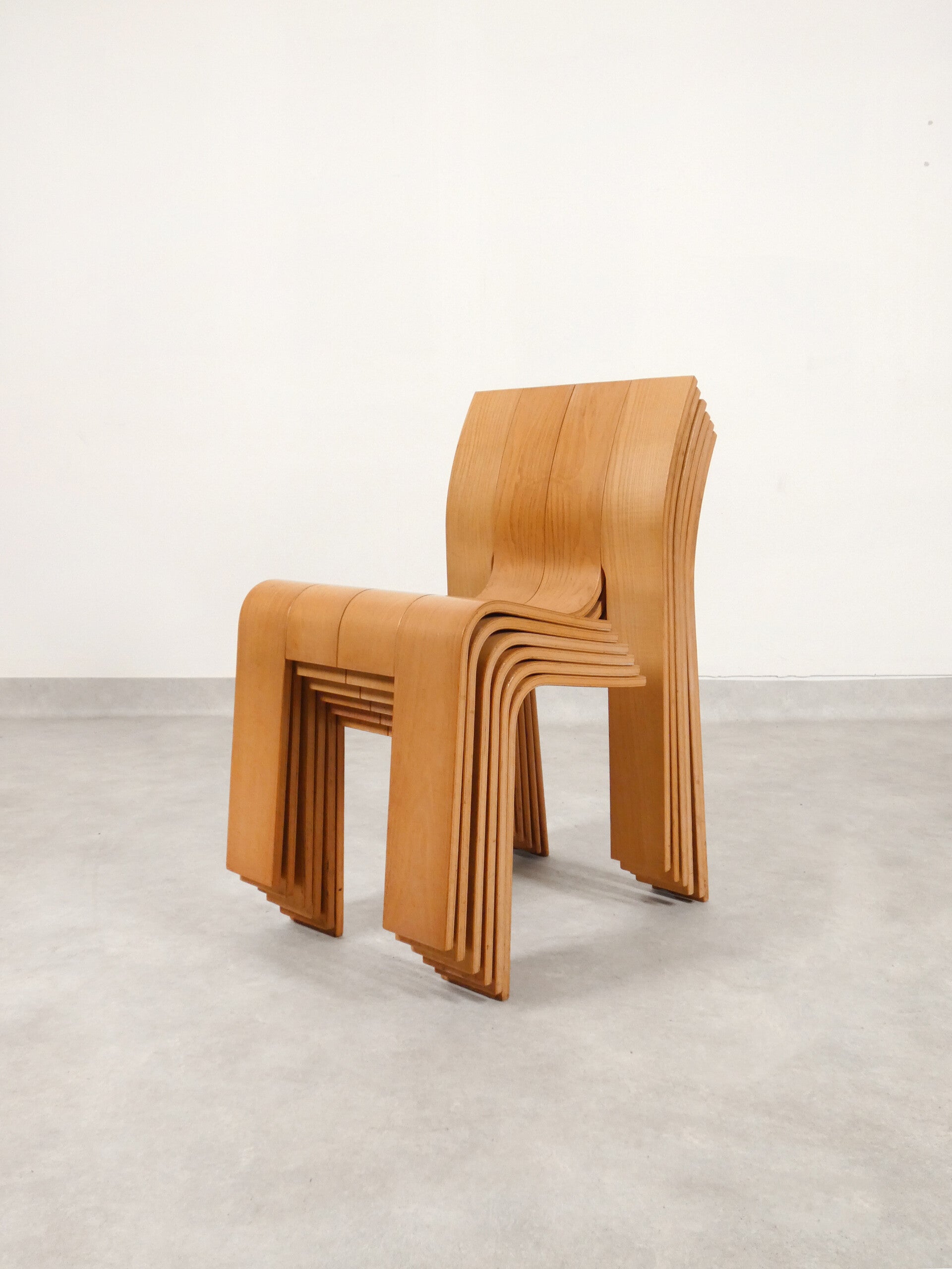Six iconic "strip" chairs designed in 1974 by Gijs Bakker for Castelein. The concept behind this chair was to simplify the form, leaving only a powerful, striking silhouette.