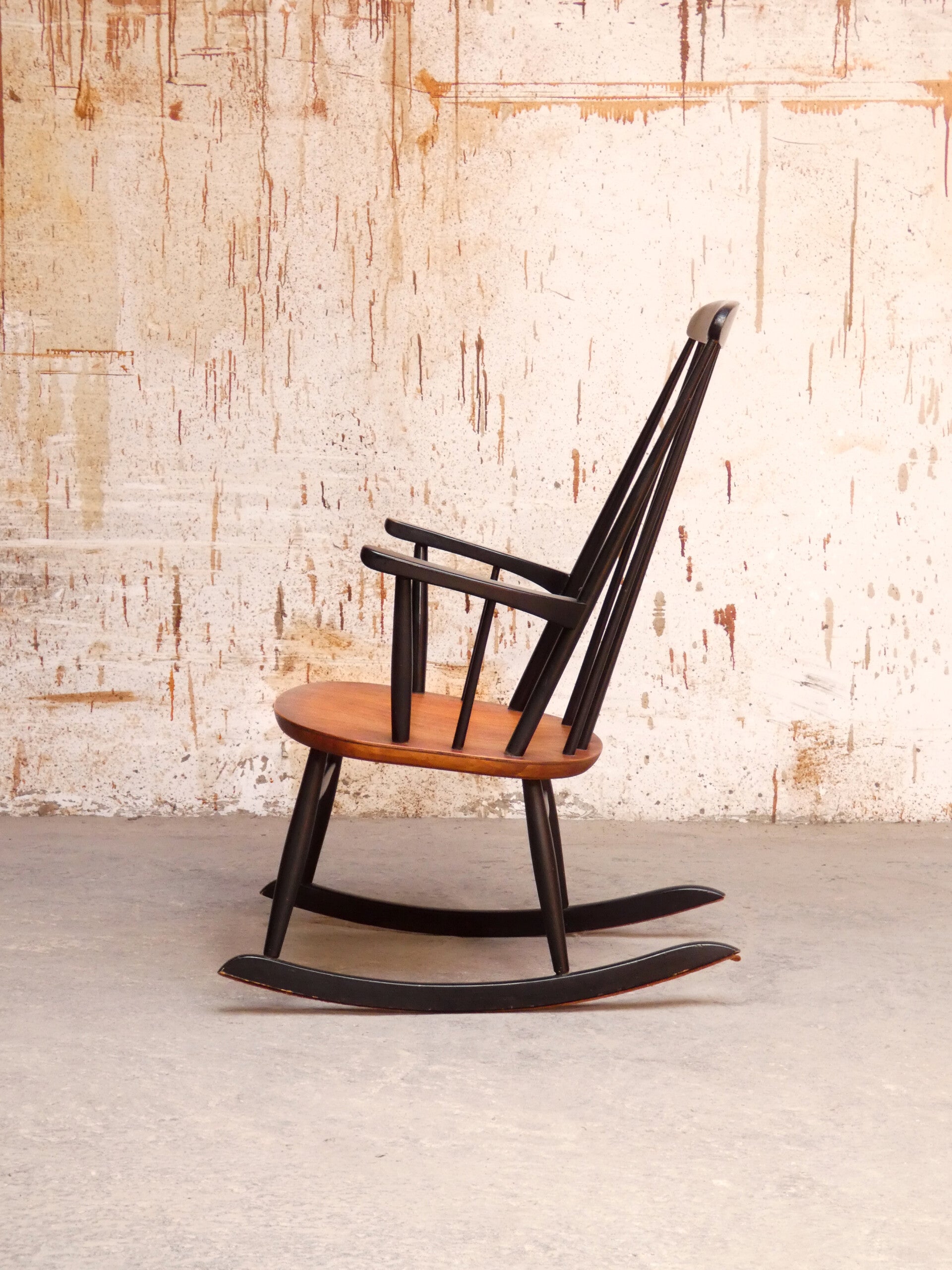 This rocking chair by Ilmari Tapiovaara is a variant of his 'mademoiselle' - chair, also with its typical high backrest.