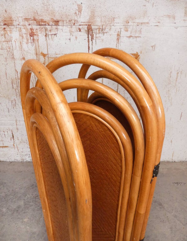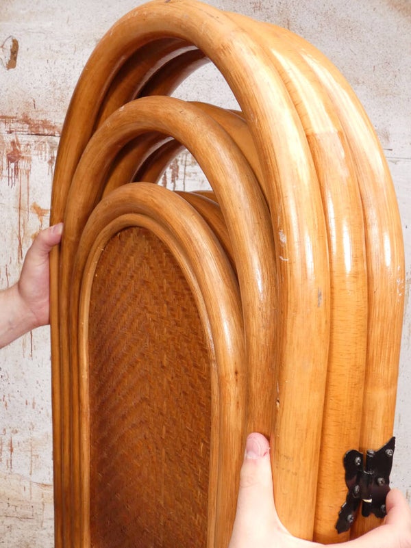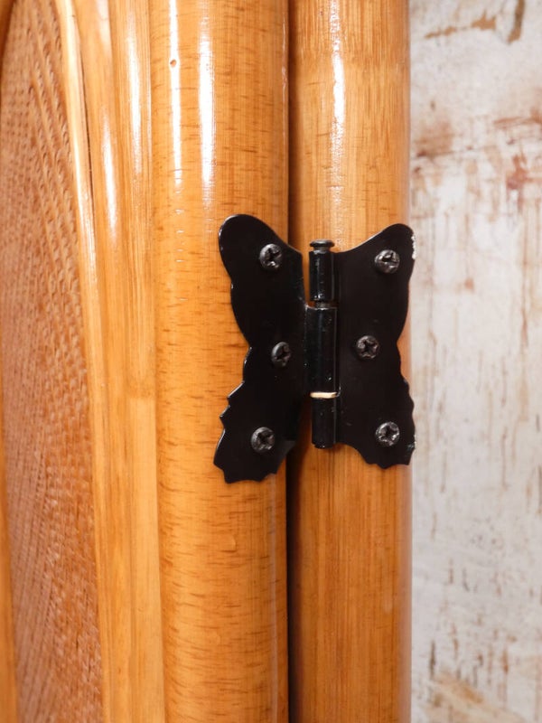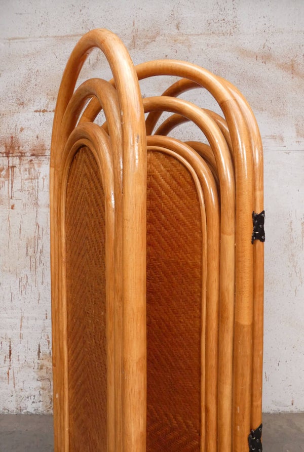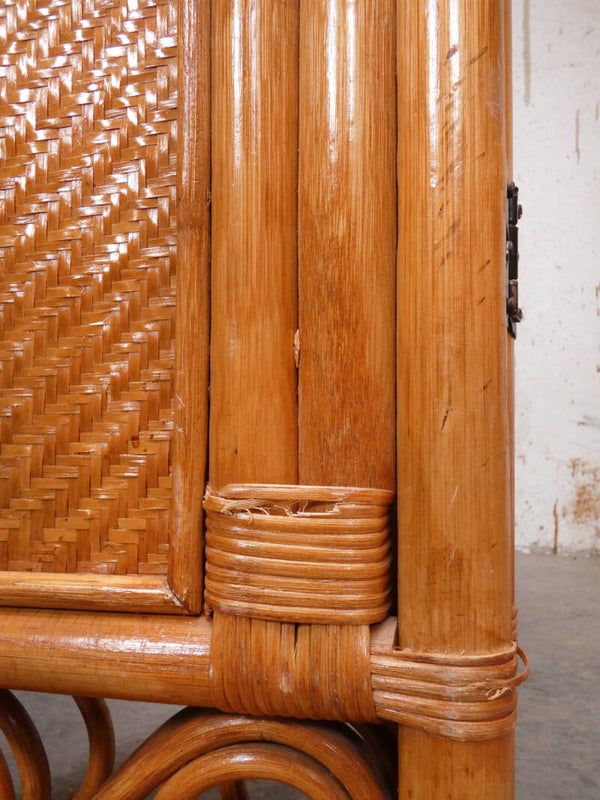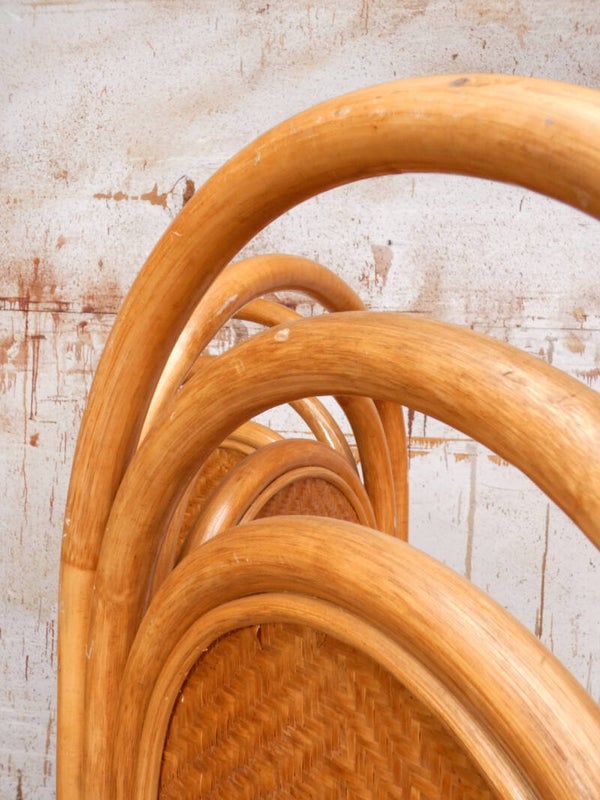 A stylish rattan vintage room divider that you don't often see anymore. The screen dates from the 60's. The manufacturer is unknown.
