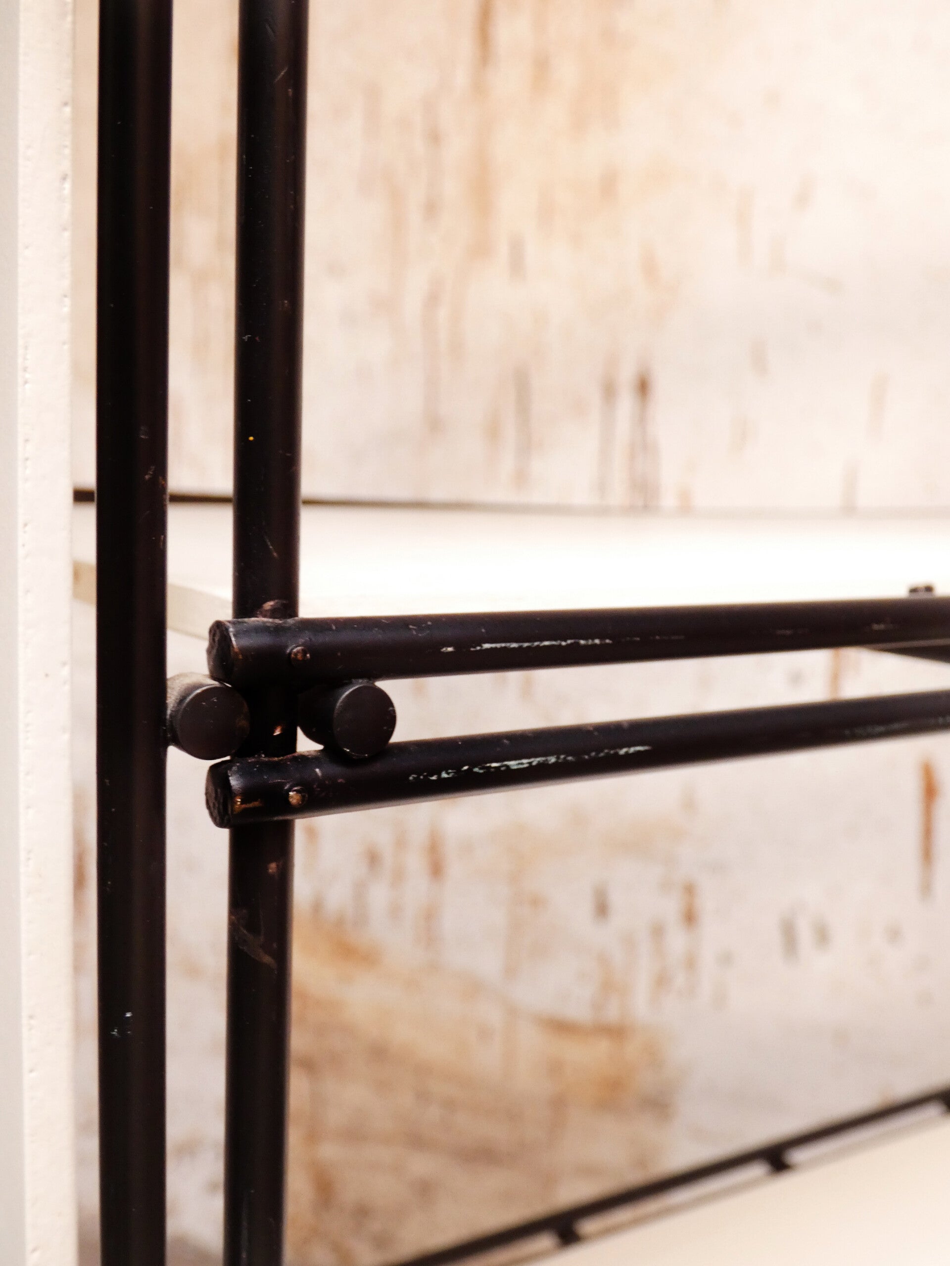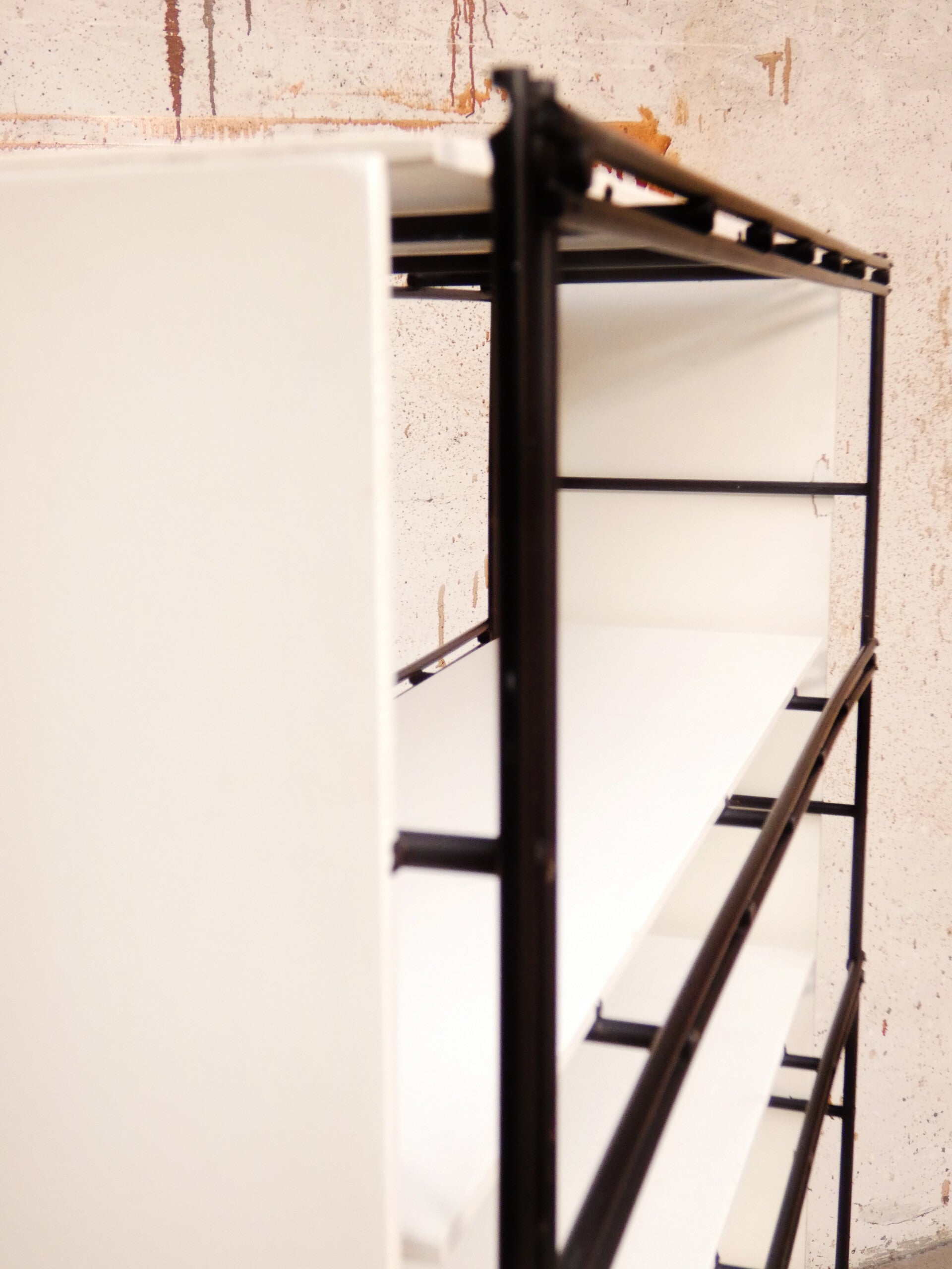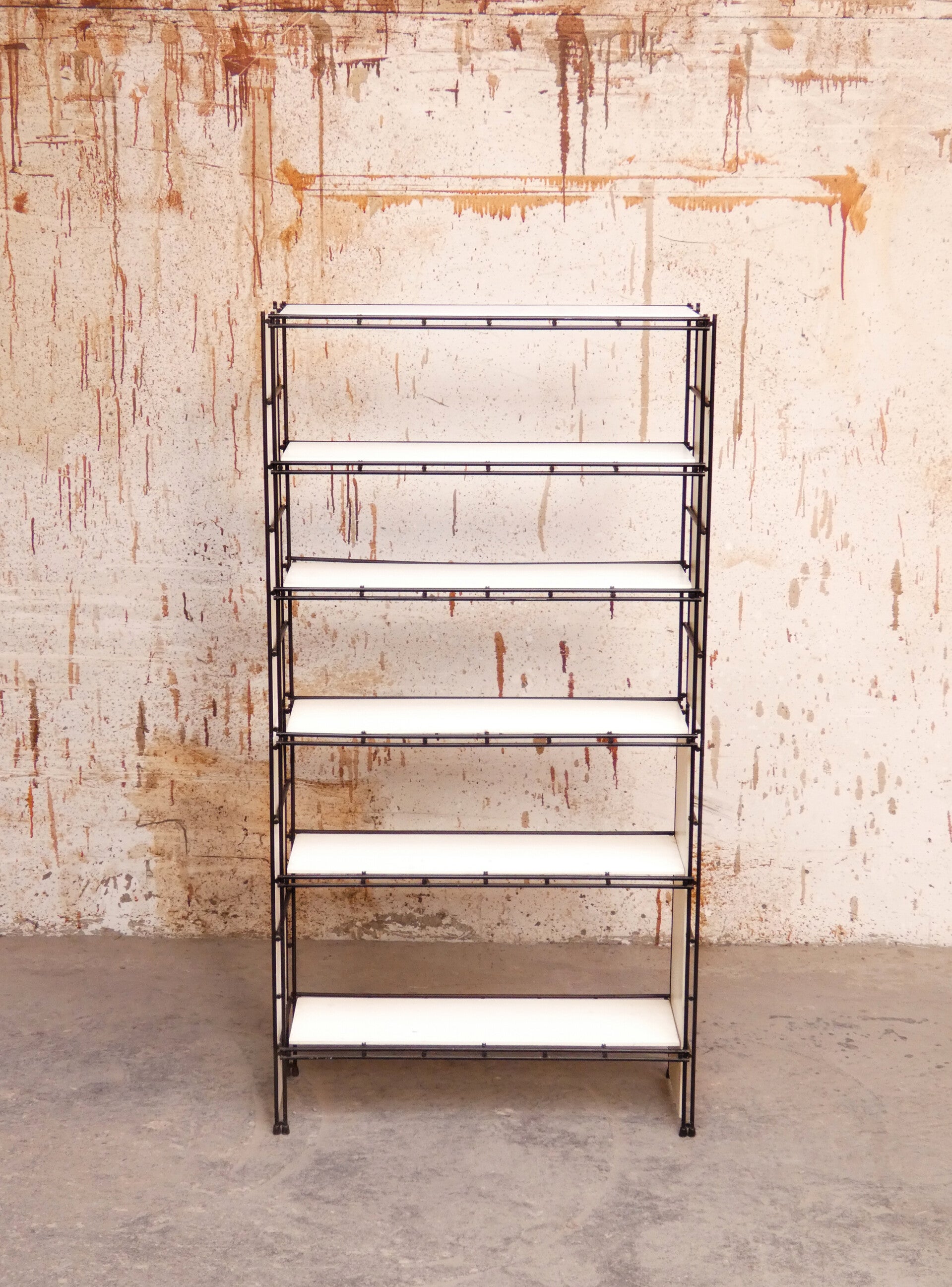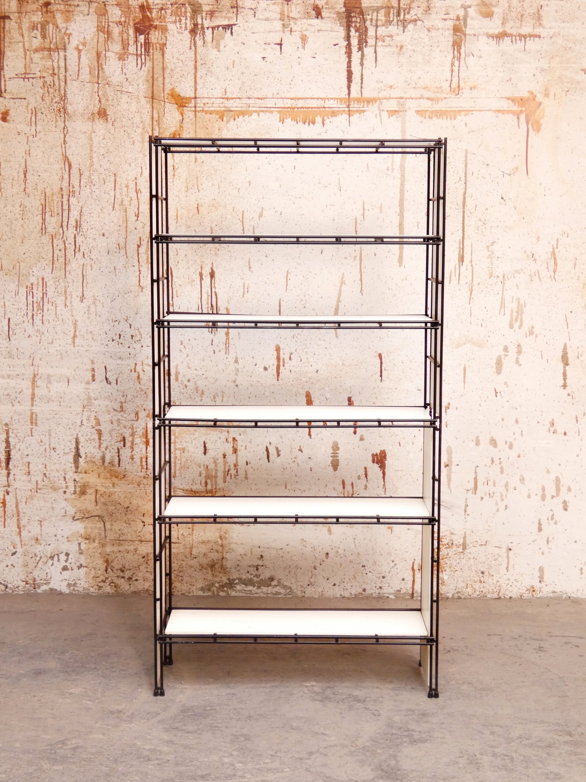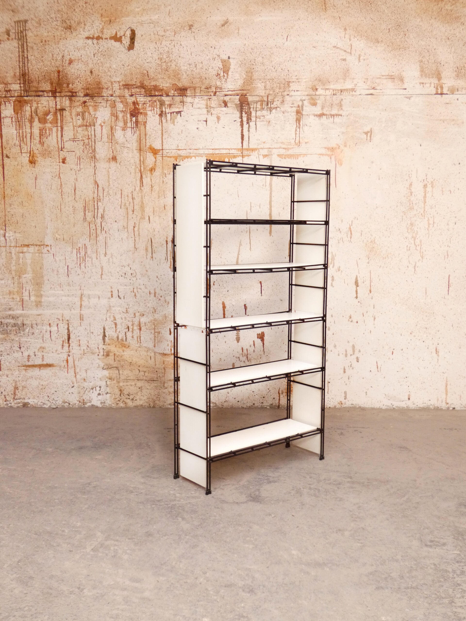 Modular shelving unit from the 1960 for the brand Multimueble Multistrux Spain. Tubular structure in matt black metal and white wooden shelves.