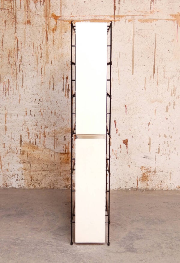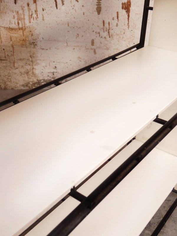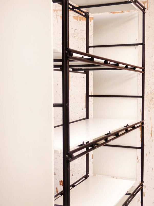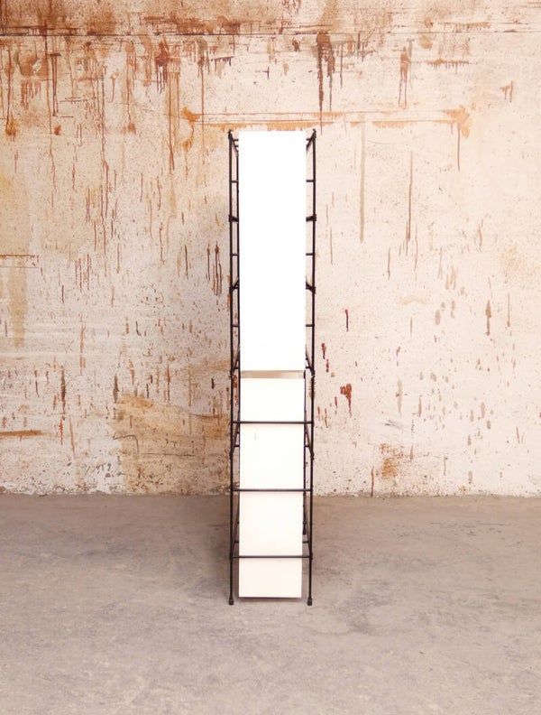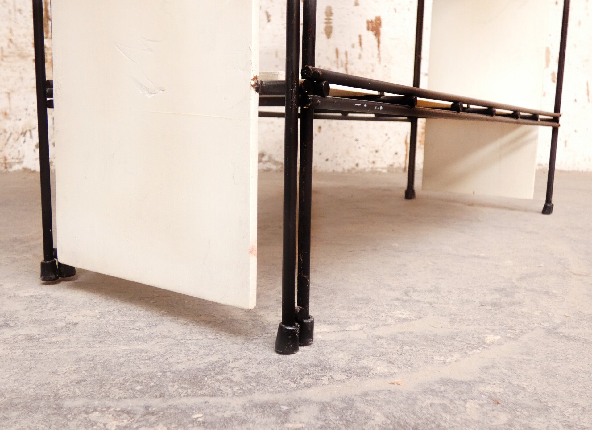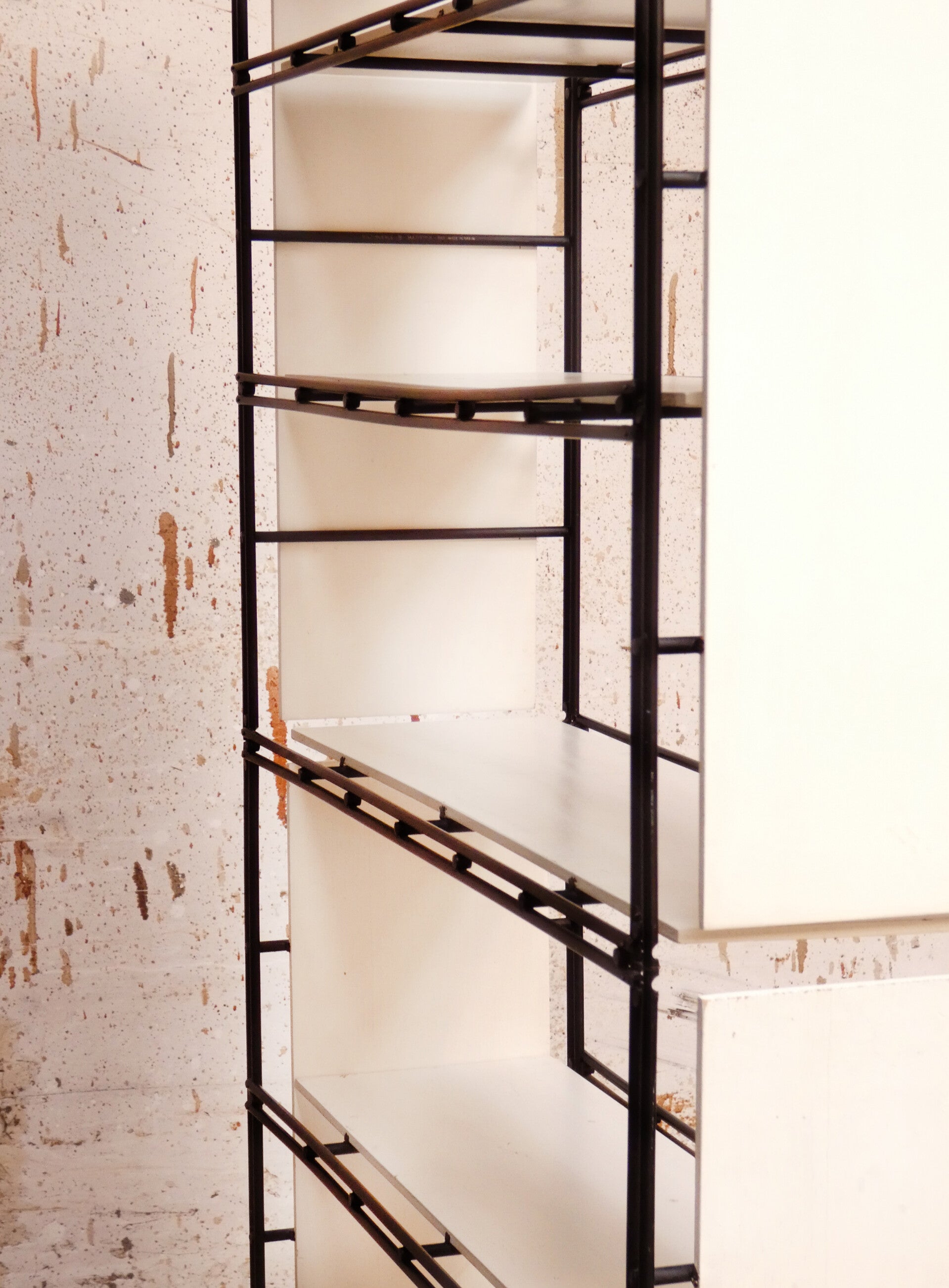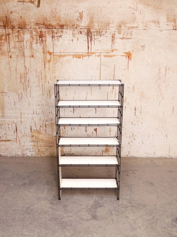 Modular shelving unit from the 1960 for the brand Multimueble Multistrux Spain. Tubular structure in matt black metal and white wooden shelves.