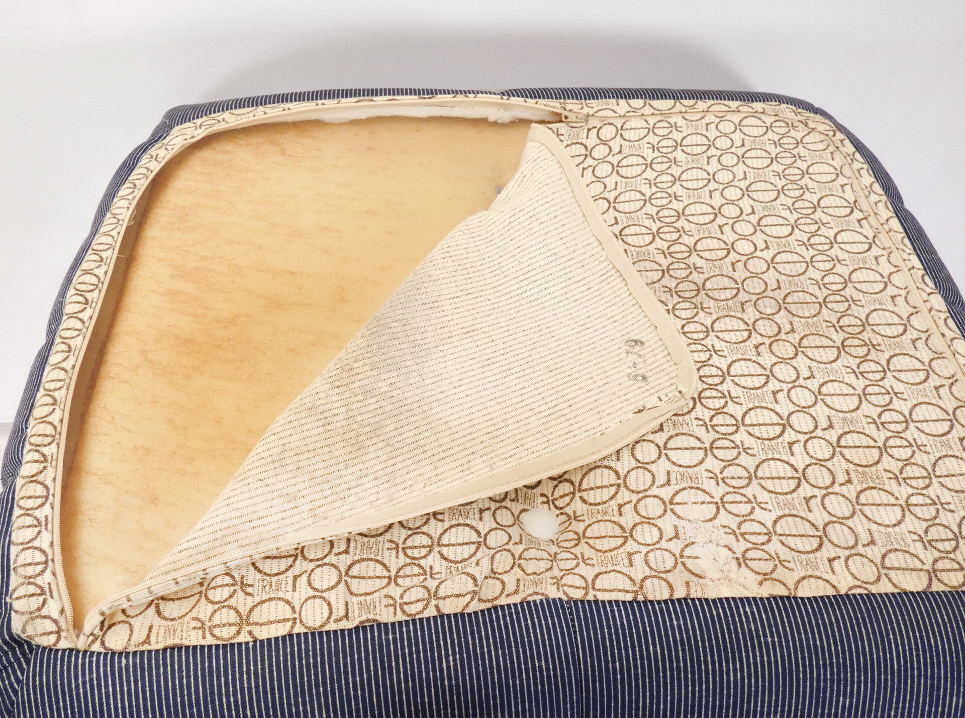 Deze originele set fauteuil en voetbank zijn professioneel herbekleed met een hoogwaardige, zachte en soepele Lars Nautica stof met een speels donkerblauw en off-white gestreept motief.