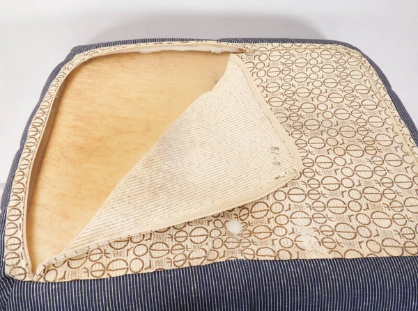 This set is newly & professionally reupholstered in high-quality, soft and supple Lars Nautica fabric featuring a playful dark blue and off-white pin-striped pattern.