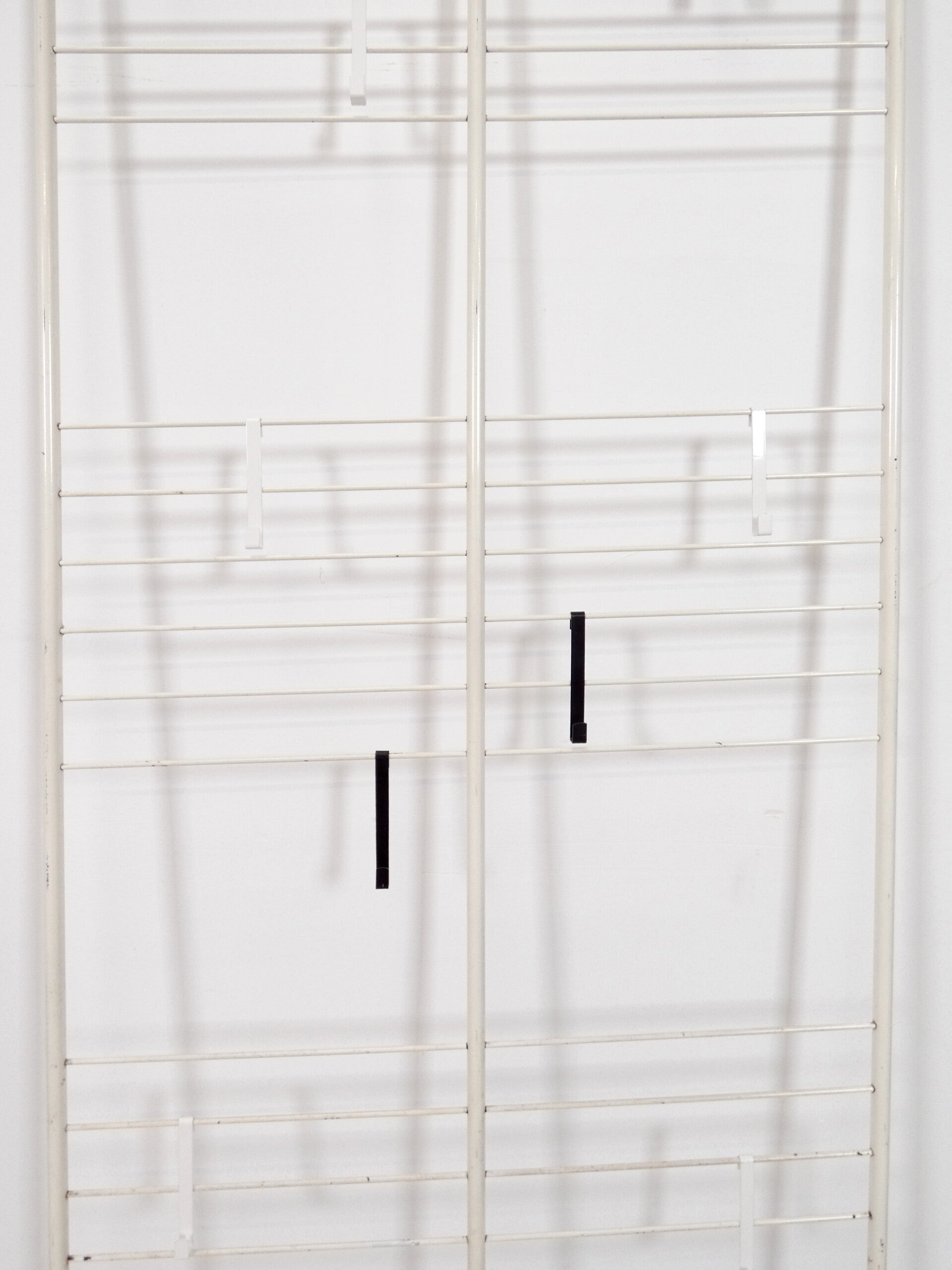 This Toonladder coat rack is made of a white laquered round metal frame, and 9 metal lacquered coat hooks: 6 white, 3 black.