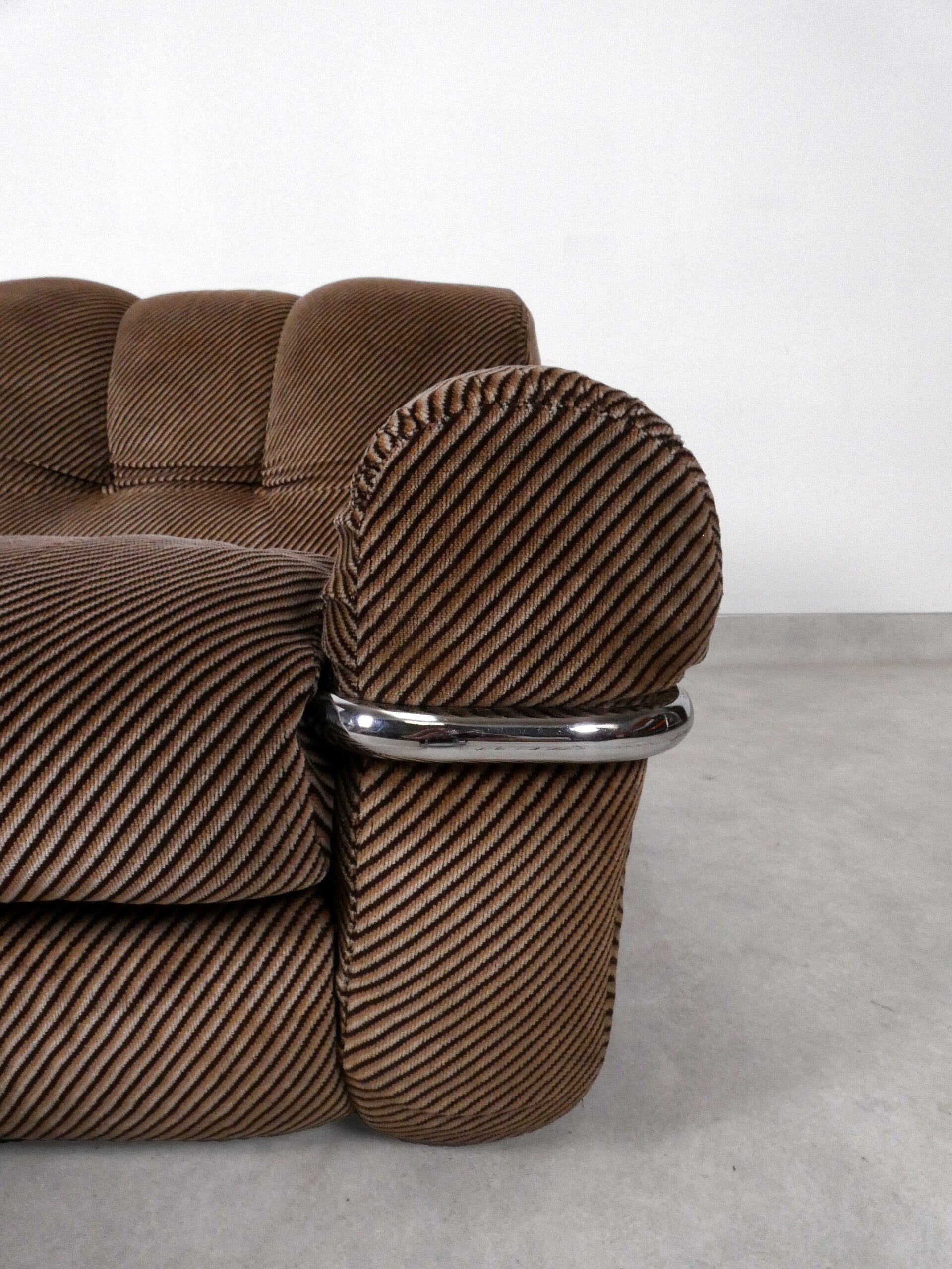 The sofa features a wooden frame upholstered in foam, finished with the original striped velvet fabric, and supported by chrome-plated steel tubing.