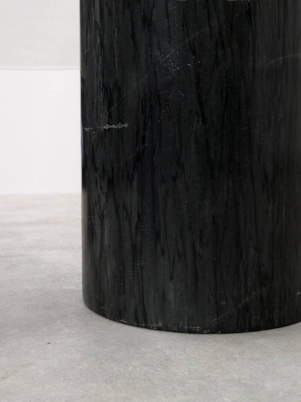 Beautiful black and grey vained marble shapes: one is a rectangular block, one a cylindrical column, and the third a tapered cone.