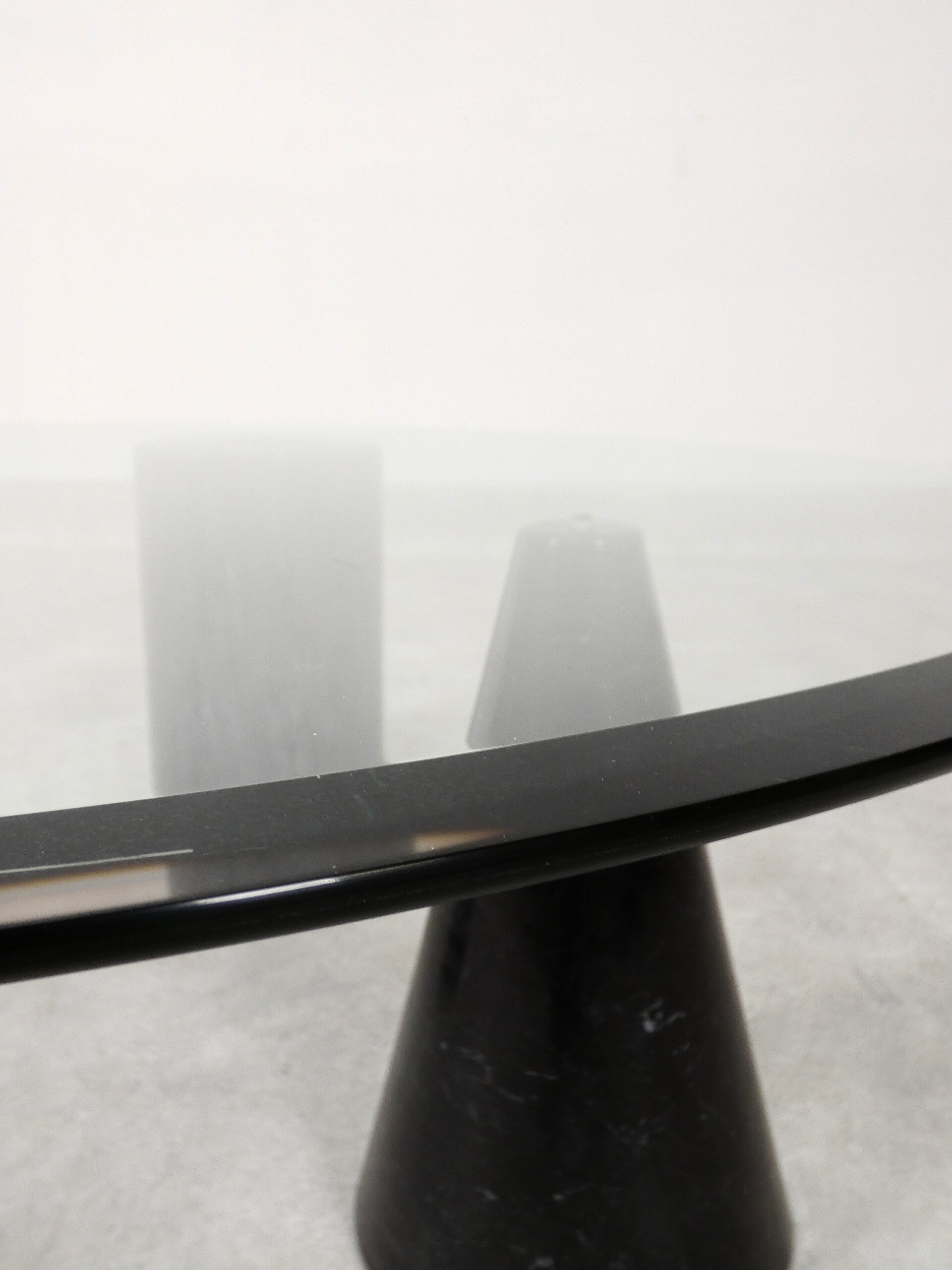 Italiaanse salontafel met een helder glazen blad en geometrische massieve marmeren vormen, in de stijl van de ontwerpen van Massimo Vignelli.