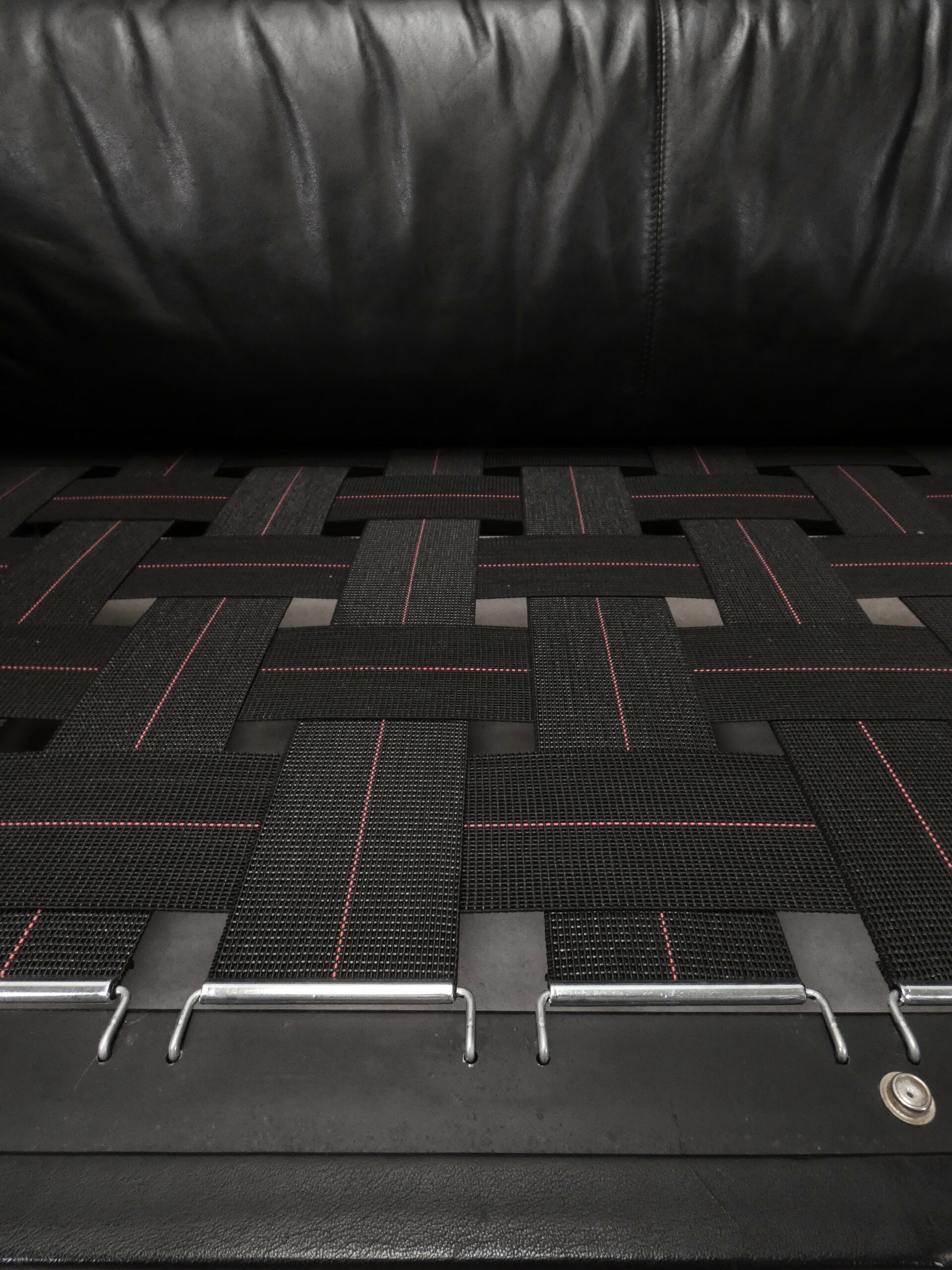 De sofa heeft een zwart hoogglans gelakt houten frame, gecombineerd met de originele zwarte lederen bekleding, die in de loop der tijd een lichte patina heeft ontwikkeld.
