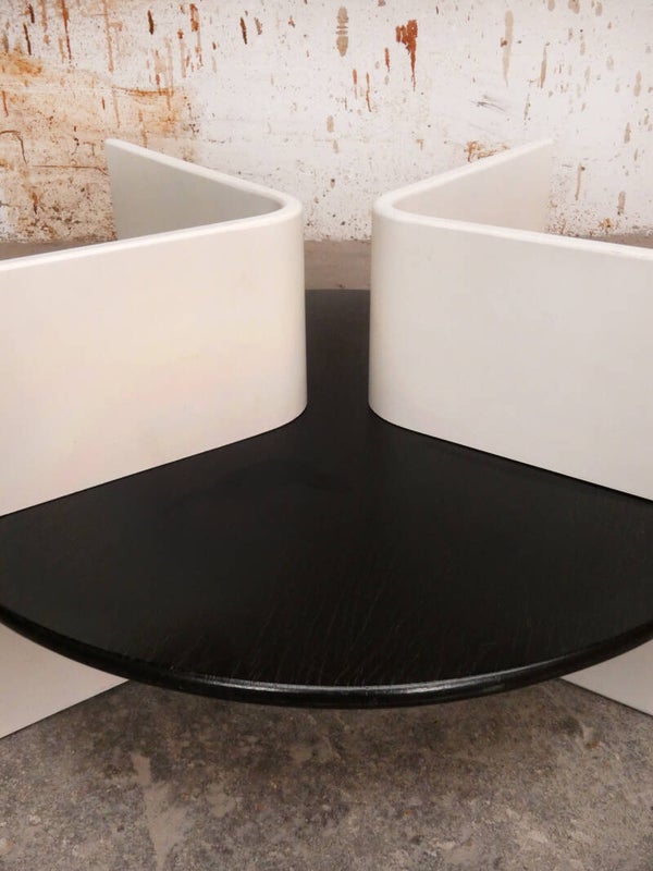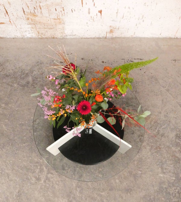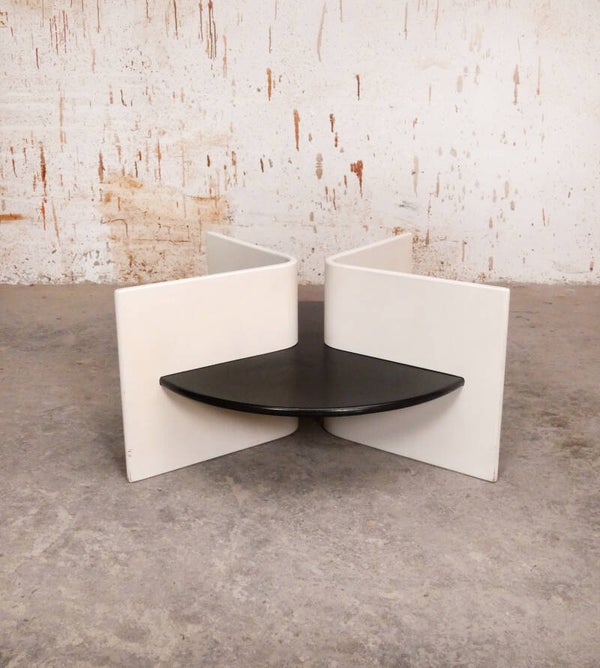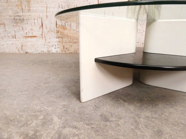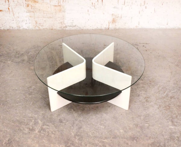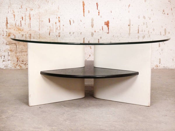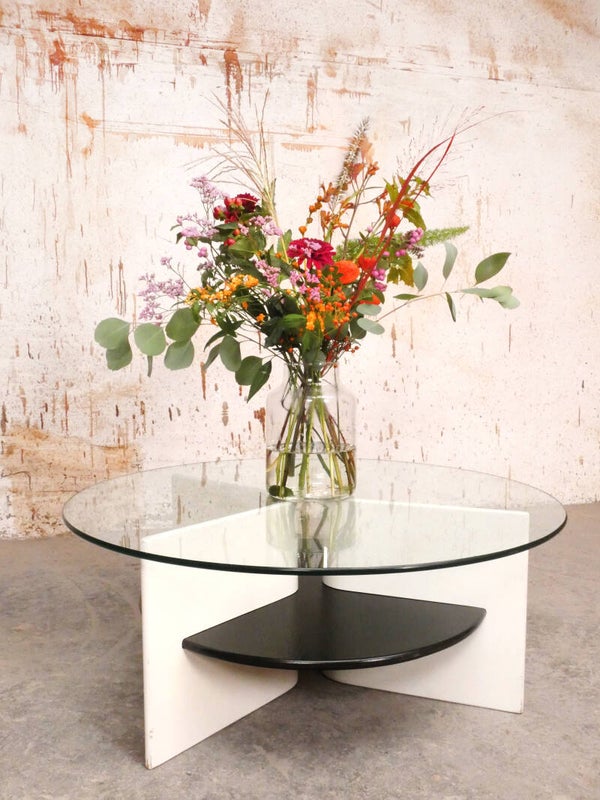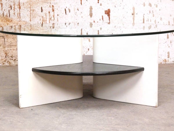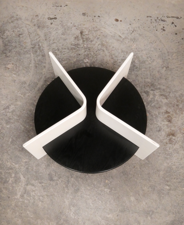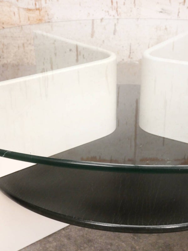 Very cool structural coffee table made out of bent plywood piecesand a glass top.