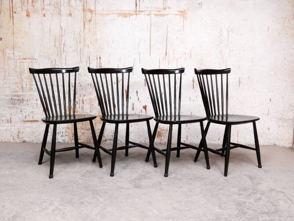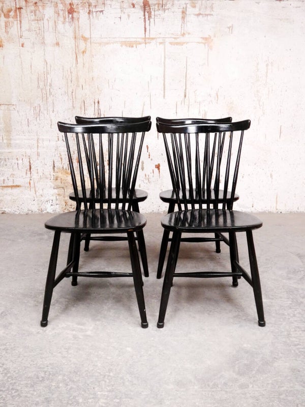 4 tijdloze 'spindleback' stoelen ontworpen in 1966 ontworpen door Yngve Ekstrom voor Nesto. Later succesvol geimporteerd door Pastoe, Nederland.