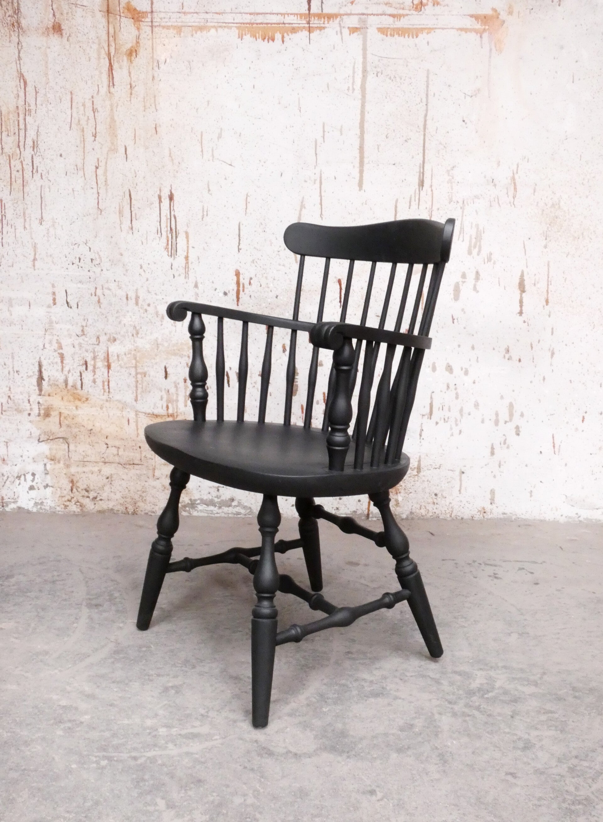 Antieke Windsor stoel met armleuningen en spijlen rugvlak in zeer mooie staat, opgeknapt met een laagje mat zwarte verf.