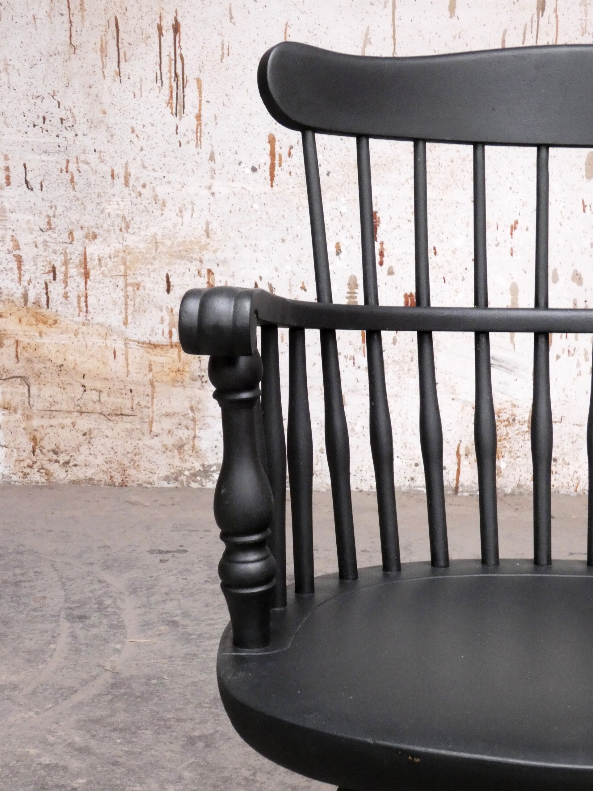 Antique Windsor chair with armrests and bar back in very nice condition, refurbished with a layer of matt black paint.