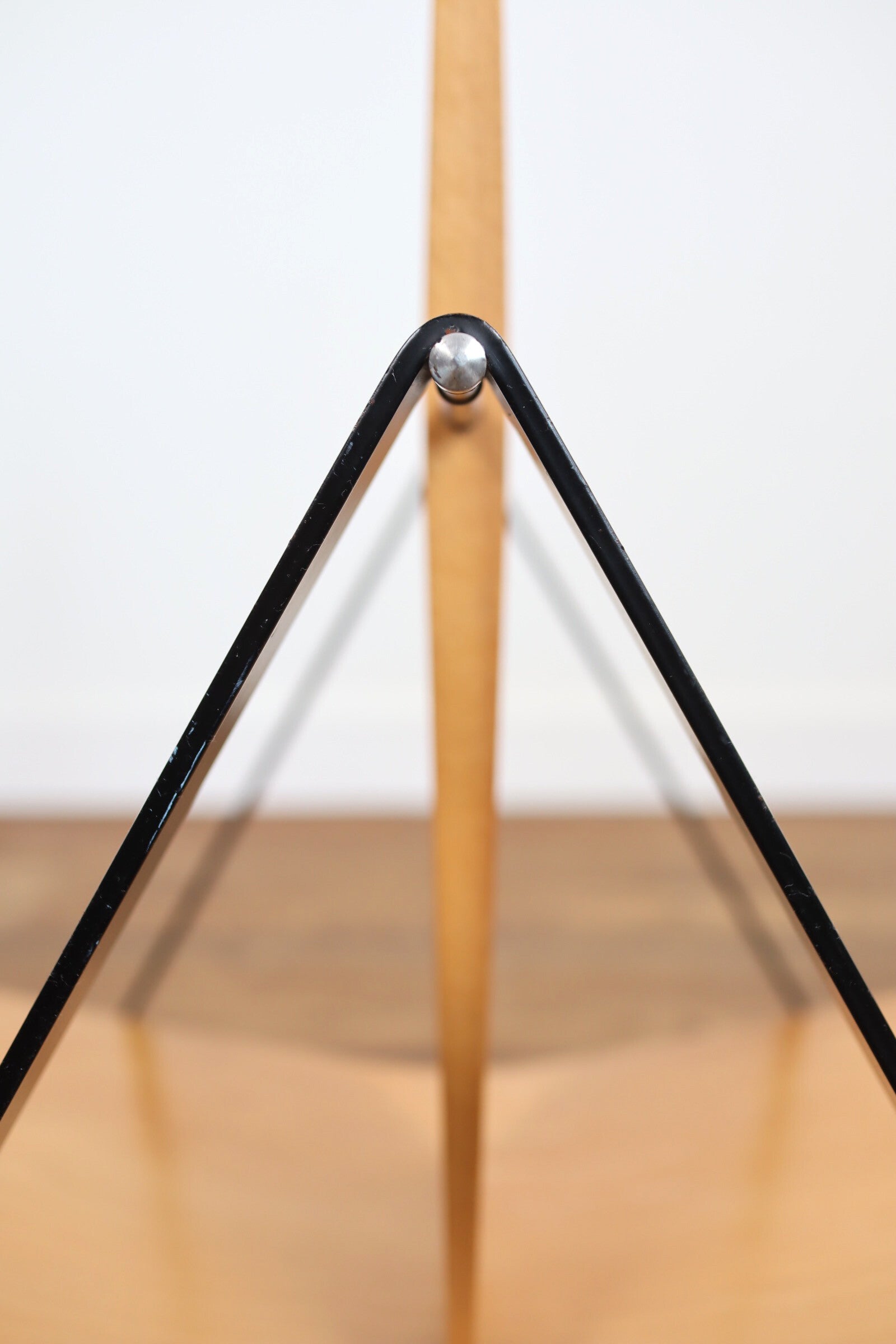 EN: Simple and elegant magazine rack of thick bent plywood and very nicely shaped steel. The steel frame is finished in black paint and chrome fixing.