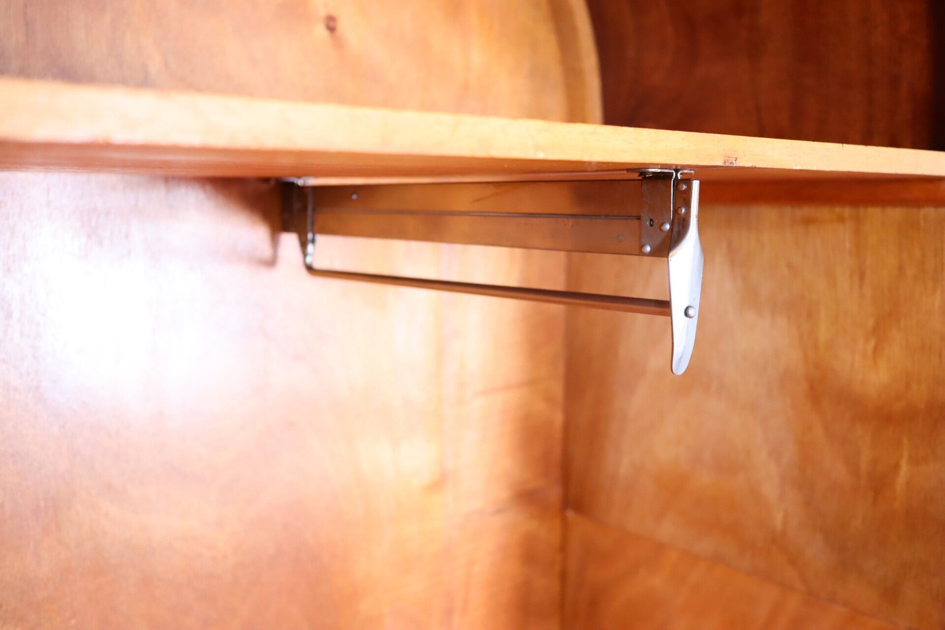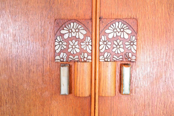 Inside there is an extendable coat rack, the left door has a small lock. The handles are beautifully finished with sculpted floral details.