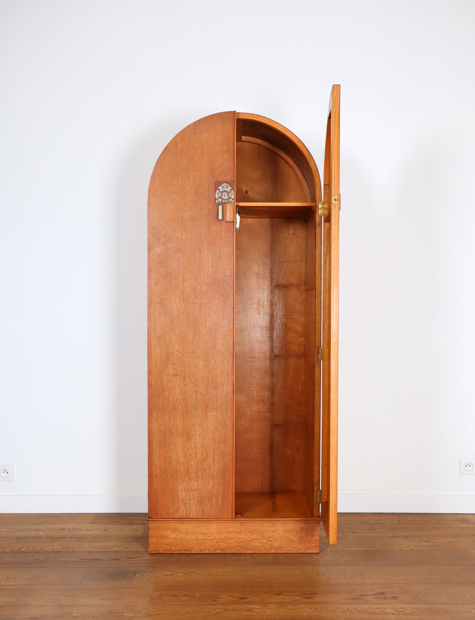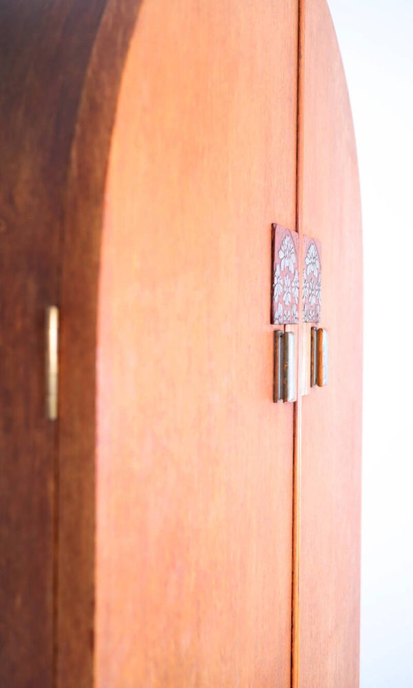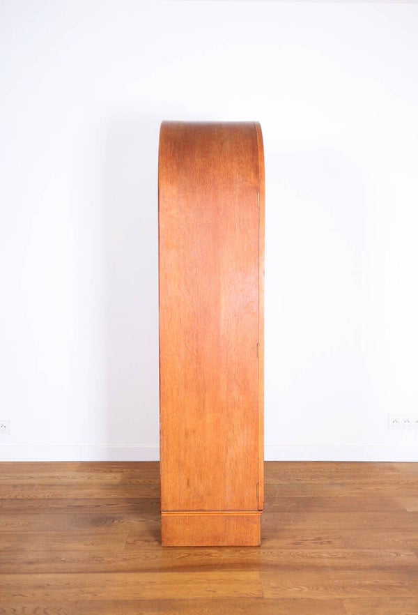Art deco wardrobe closet, with a curved top made entirely of wood originating in England from the 1930s.