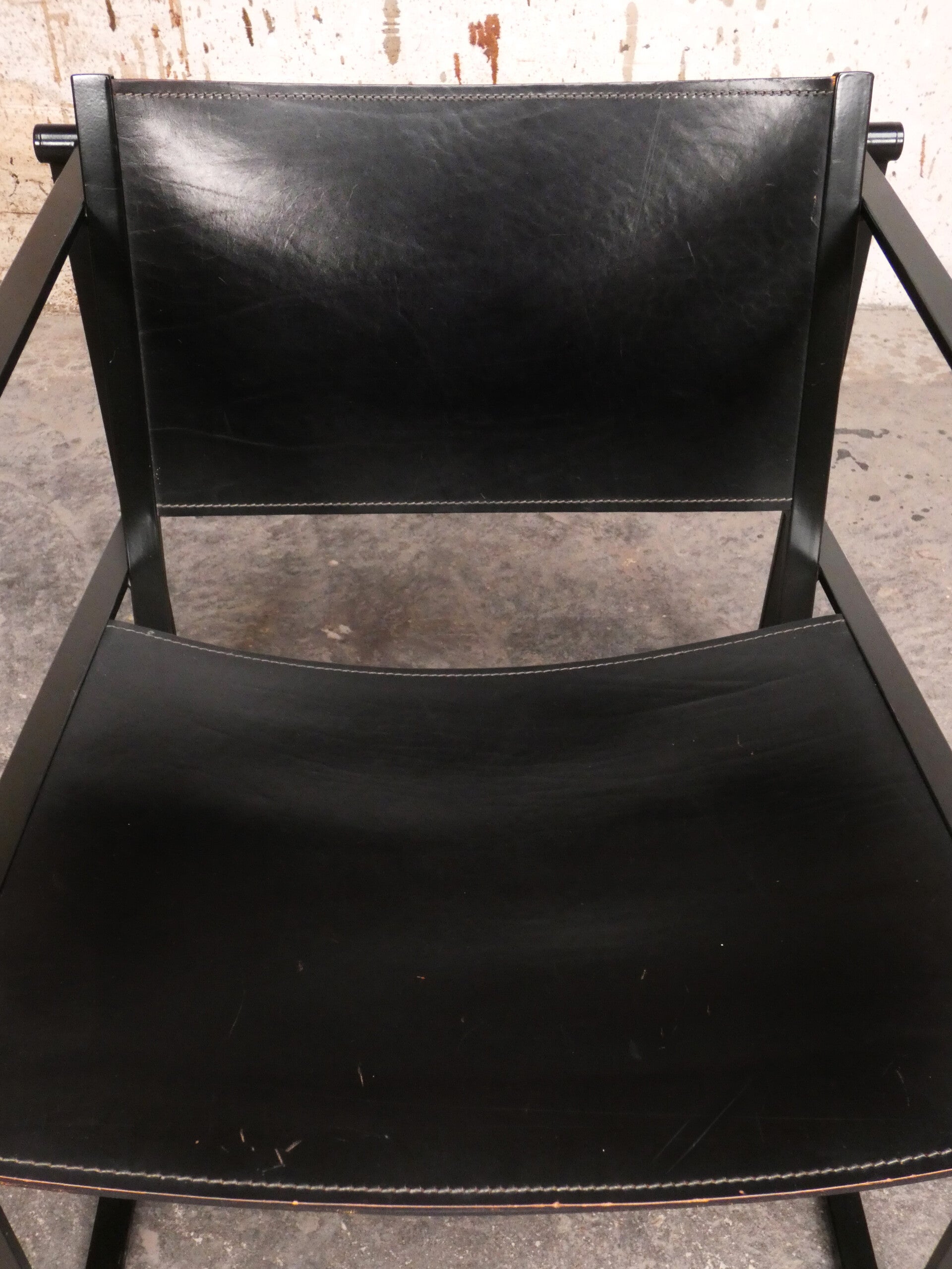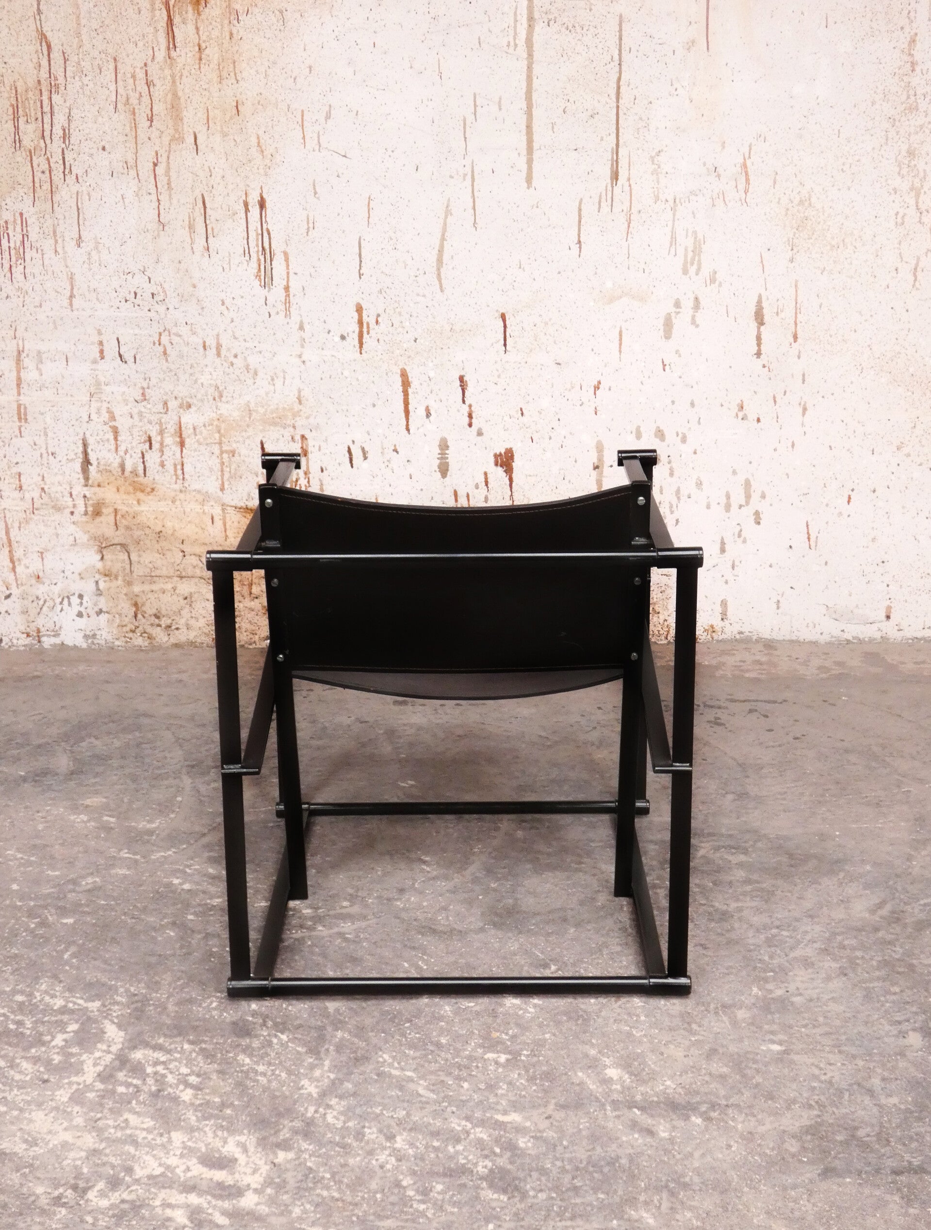 The chair offered here has a thick black leather seat and backrest in good condition. A real eye-catcher in your interior because of the angular shape of the iron Rietveld-like construction.