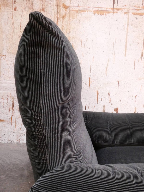 This Cassina Maralunga fauteuil is upholstered in the original bicoloure grey-black striped velvet fabric, and is designed by Vico Magistretti. A very comfortable sofa with an ingenious design that allows the headrests and backrests to be adjusted in height.