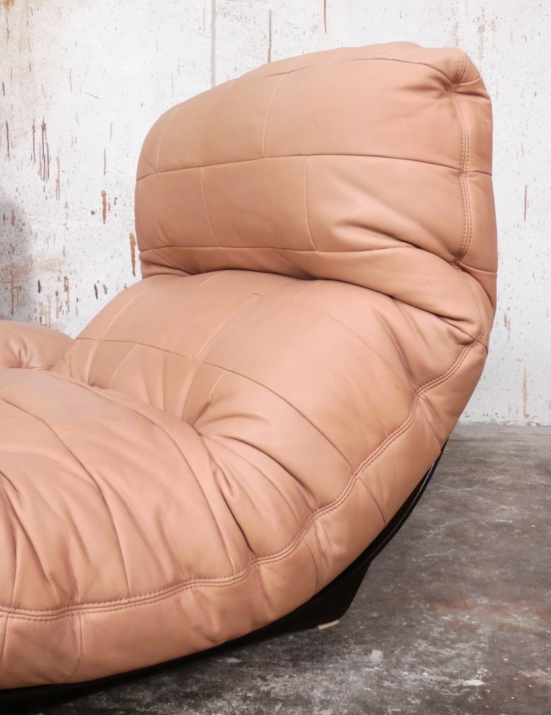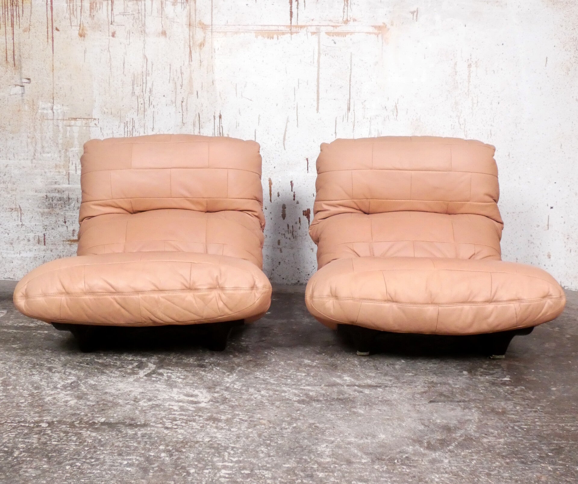 2 Marsala lounge chairs designed by Michel Ducaroy and issued by Ligne Roset in the 1980s. The seats consist of a brown plexiglass base structure with a firm cushion upholstered in original light brown/beige leather.
