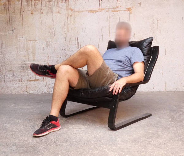 De stoel bestaat uit gebogen hout, een lage zitting met een afneembaar zwart dik lederen kussen dat rust tegen een canvas rugleuning.