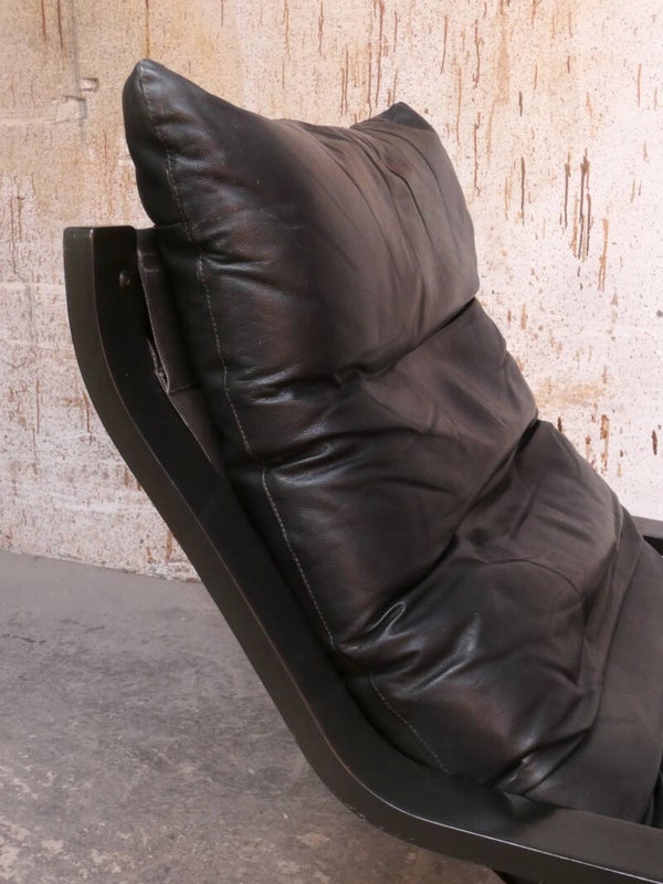 The chair consists of curved wood, a low reclining seat with a removable black thick leather cushion that rests against a canvas backing.