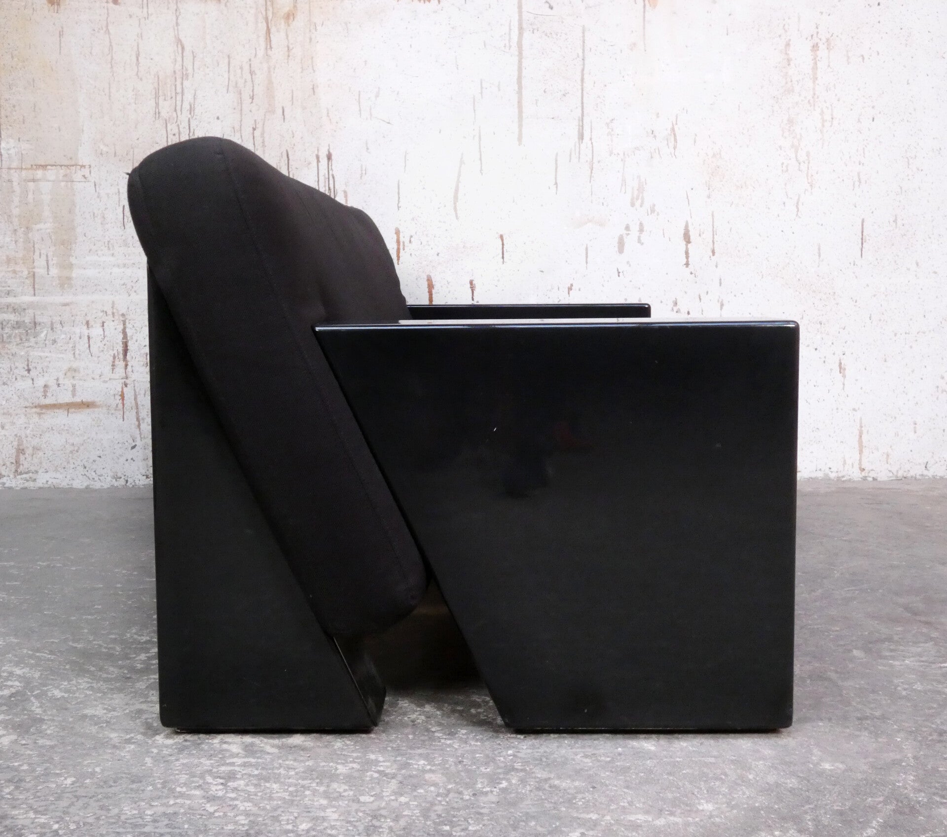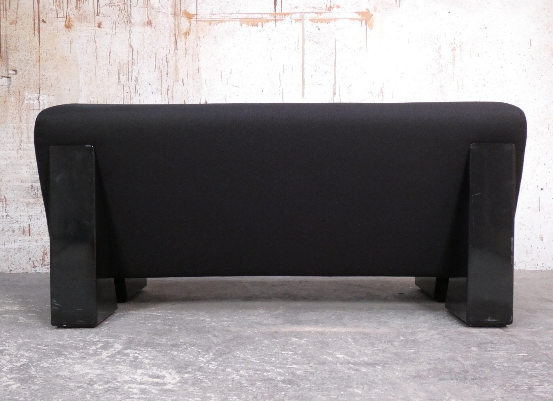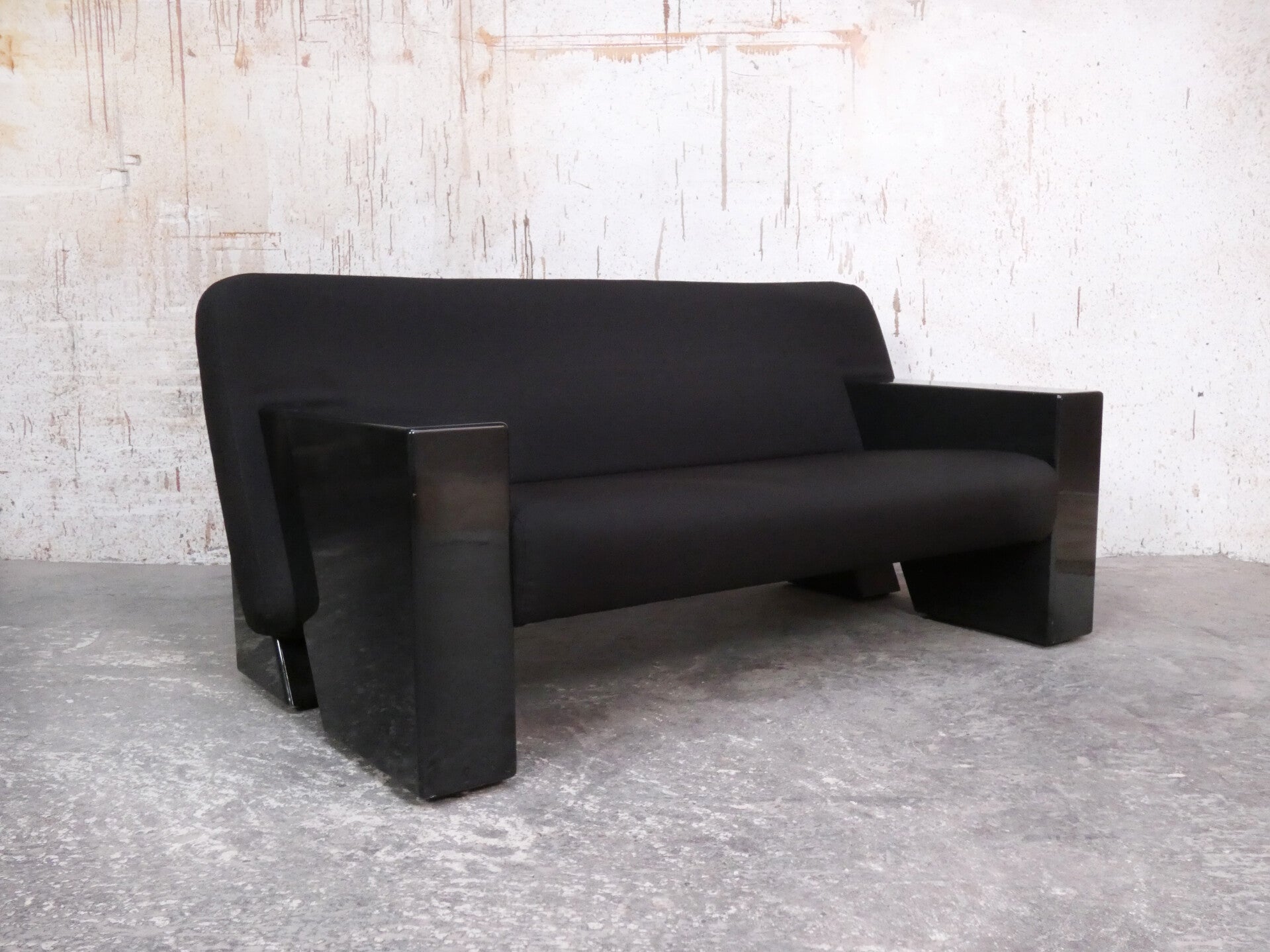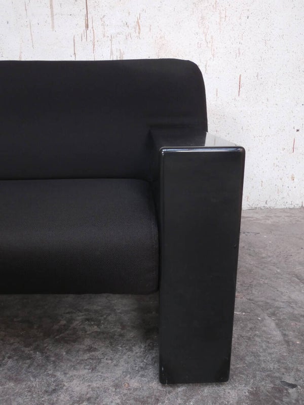 The sofa is in very nice condition considering its age with some minimal signs of use on the armrests. The black fabric is in perfect condition with no flaws or discoloration.