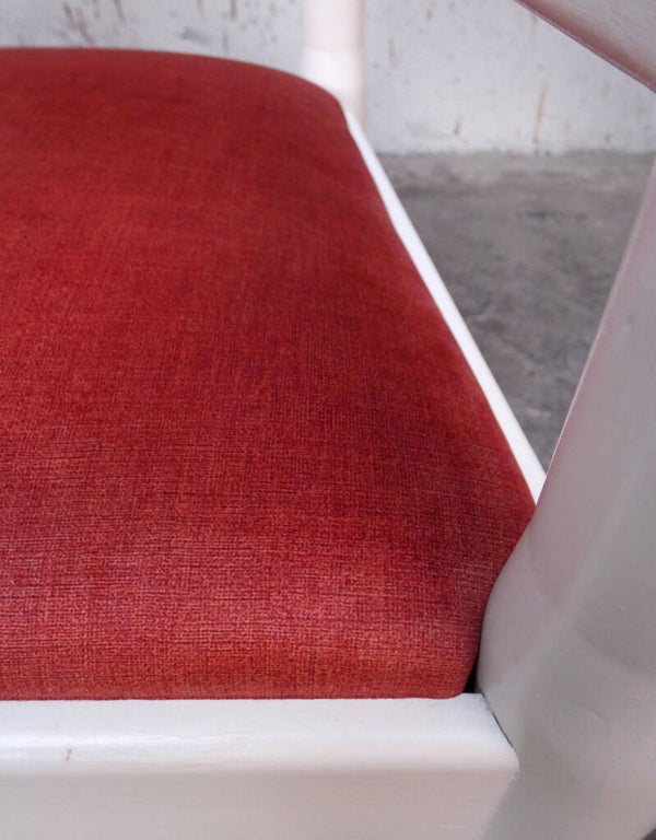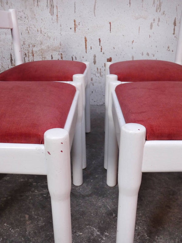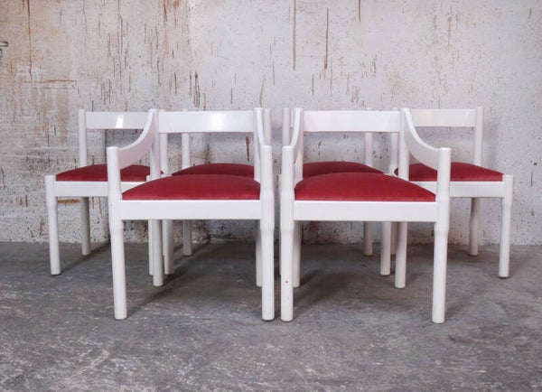 Set of 6 Cassina Carimate chairs in white lacquered beech with the original , professionally reupholstered seats in dark red velvet or velvet.