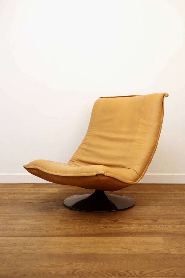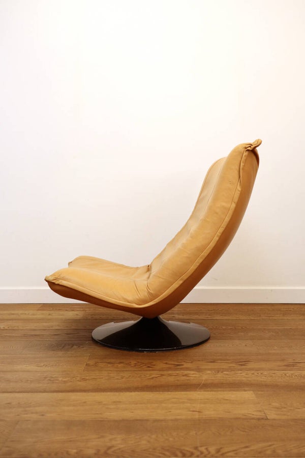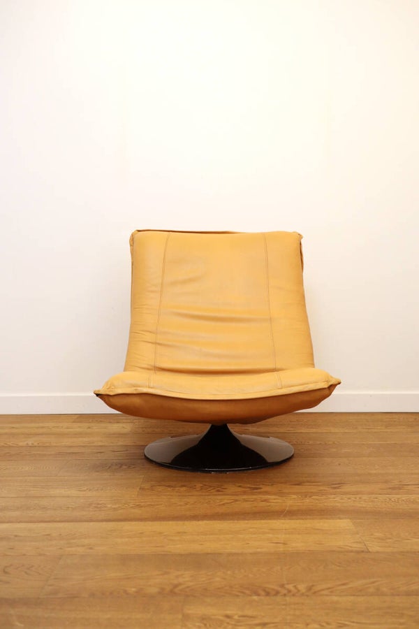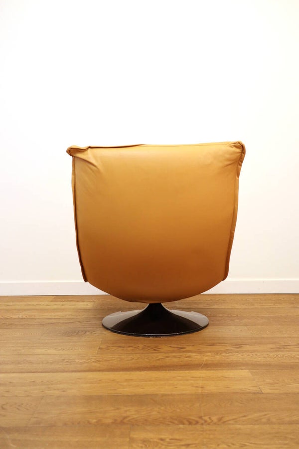 EN: Great lounge chair F980 Artifort by Geoffrey Harcourt for Artifort in cognac leather. This chair spins around on a black plastic covered metal foot.