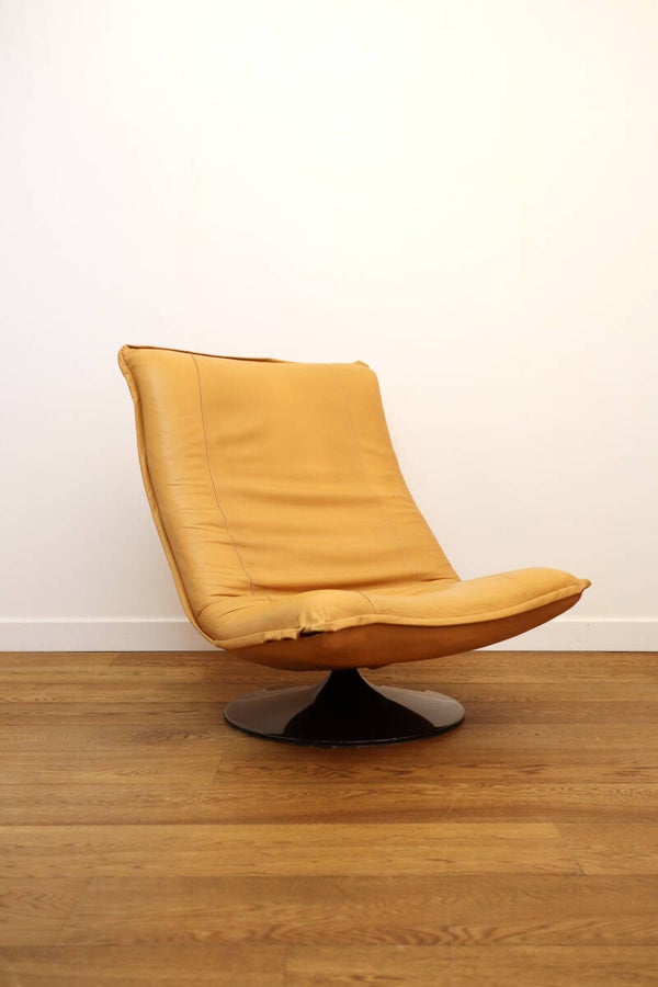 NL: Prachtige draaifauteuil F980 Artifort ontworpen Geoffrey Harcourt voor Artifort, in prima vintage staat. De zetel is bekleed met cognac leder en draait rond op een metalen voet , gehuld in zwarte kunststof.