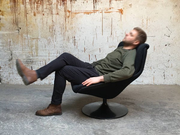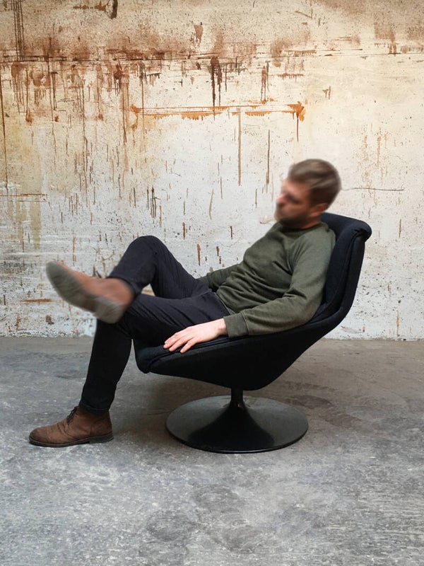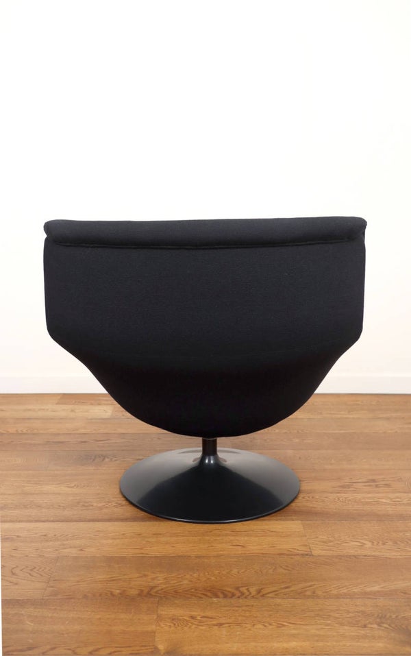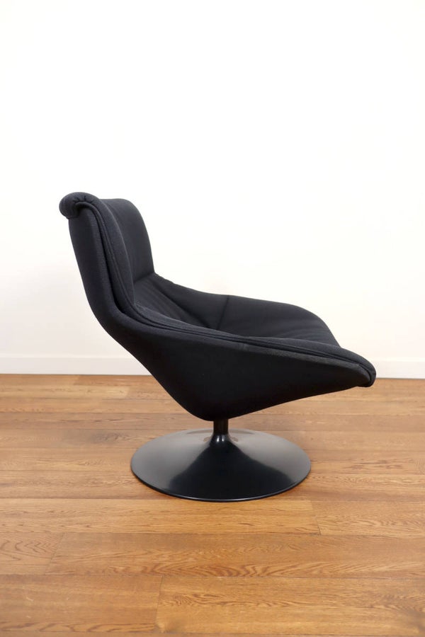 EN: Very stylish Geoffrey Harcourt lounge armchair for Artifort, designed in the 60's'. This model F522, in full original condition, is upholstered in the original black plow fabric in very good condition and can fully rotate on its black metal base.