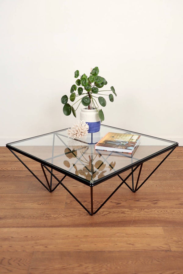 Prachtige piramide vormig gelakt metalen frame met daarop een glazen blad. Algemeen in heel goeie staat.